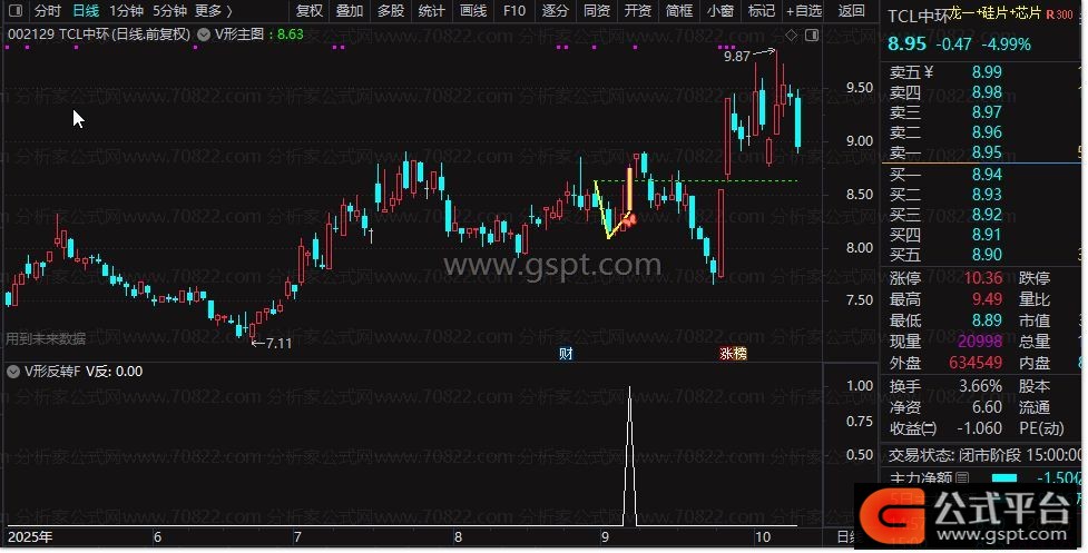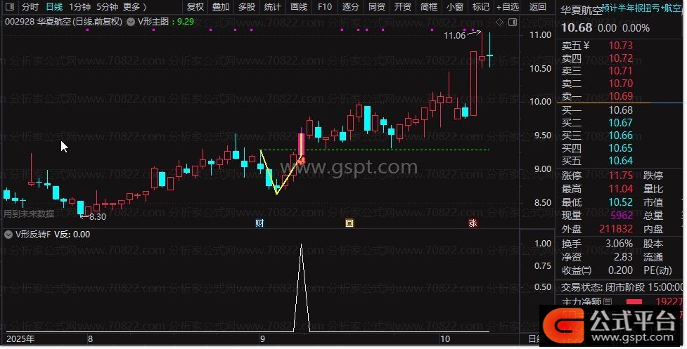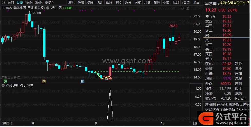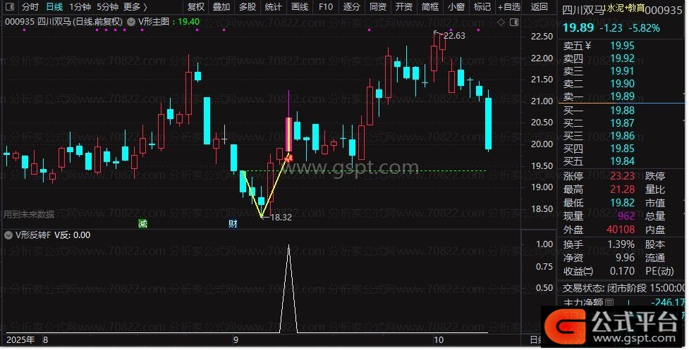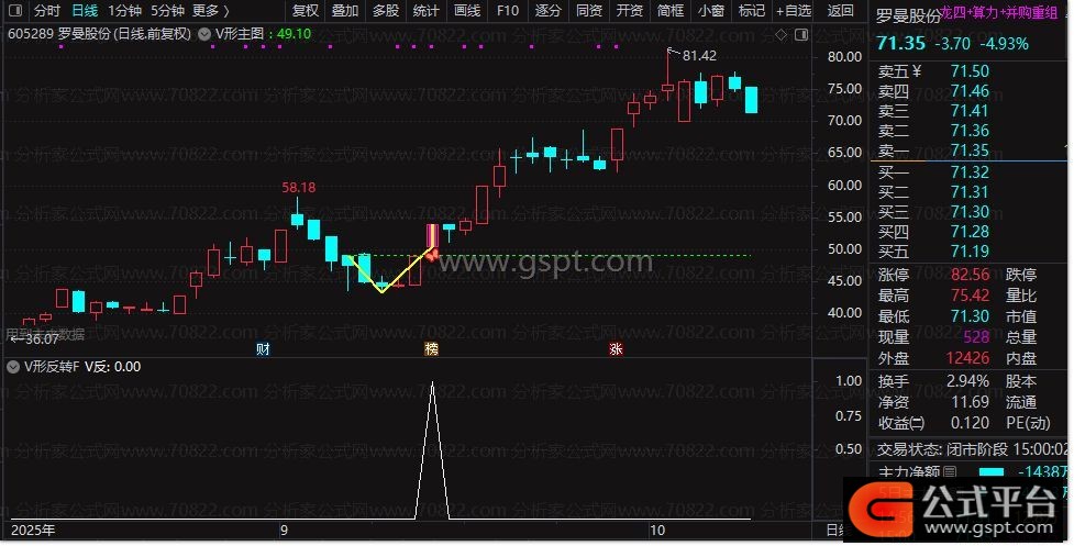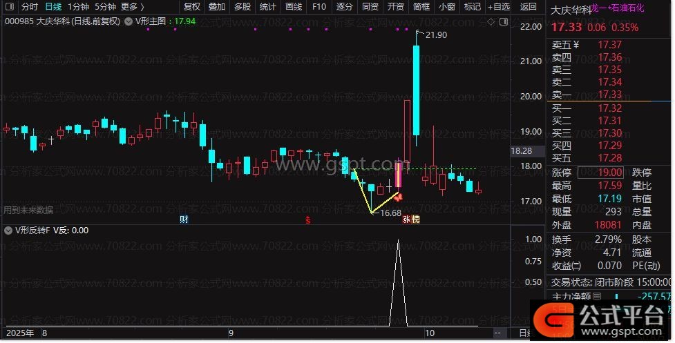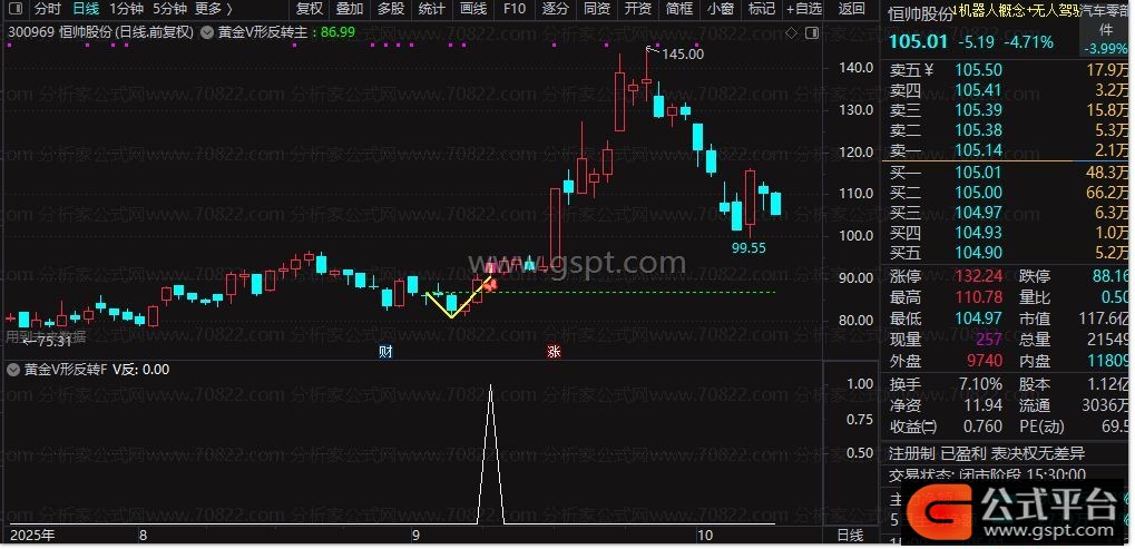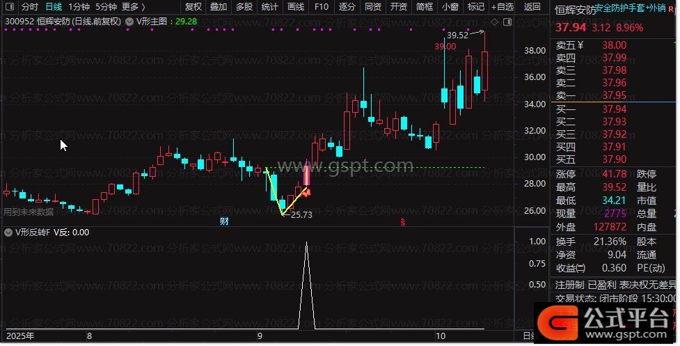 策略特别加入风控过滤机制,自动排除ST股、科创板及涨跌幅过小的标的,同步配合量能验证(换手率≥1.5%、振幅>1%),确保信号出现在活跃度充足的品种中。当条件触发时,图表将绘制黄色V形连接线标注形态结构,并以紫色K线配合底部箭头进行视觉警示。