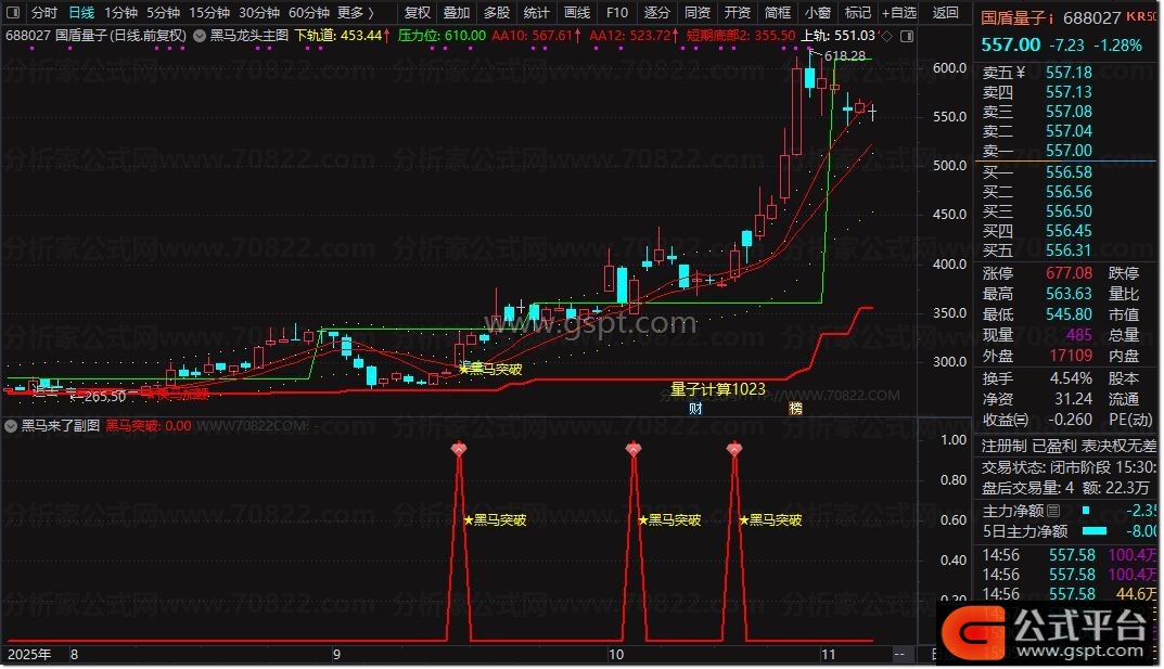 本公式通过多维技术分析,精准捕捉黑马股启动信号。核心采用三轨通道(上/中/下轨)界定股价运行空间,结合KDJ多周期共振、均线系统排列以及量价关系,在关键位置提示买入机会。