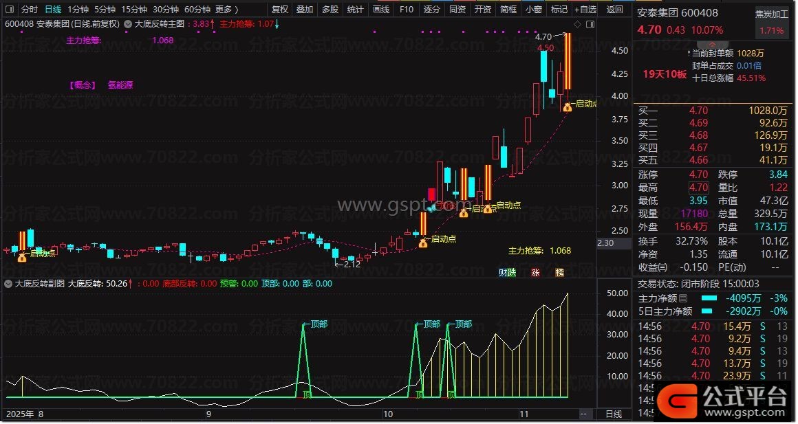底部1:=gspt1/REF(V,1)*100;
