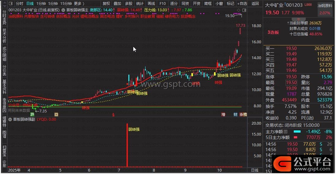 关注1:=REF(gspt5,1)>50 AND gspt5-REF(gspt5,1)>40;