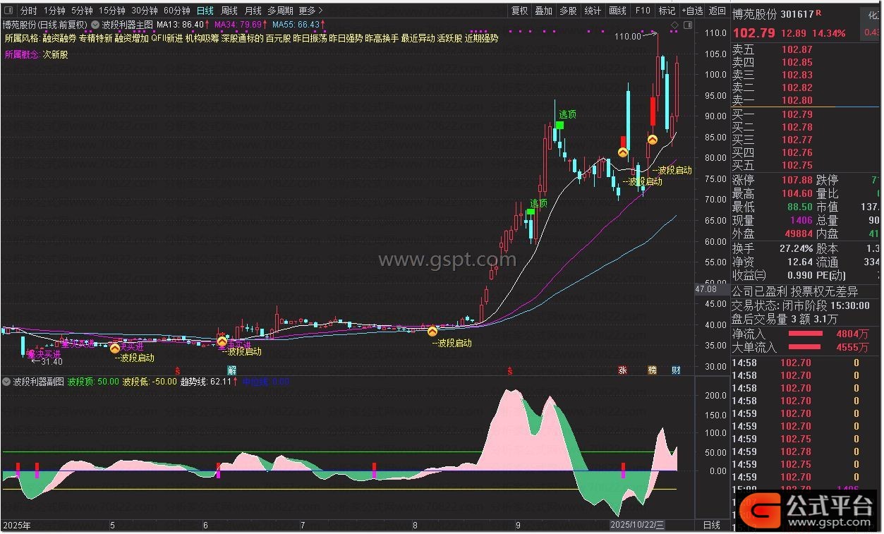 DRAWTEXT(CROSS(天线,多方趋势),H*1.04,'逃顶'),COLOR00FF00;