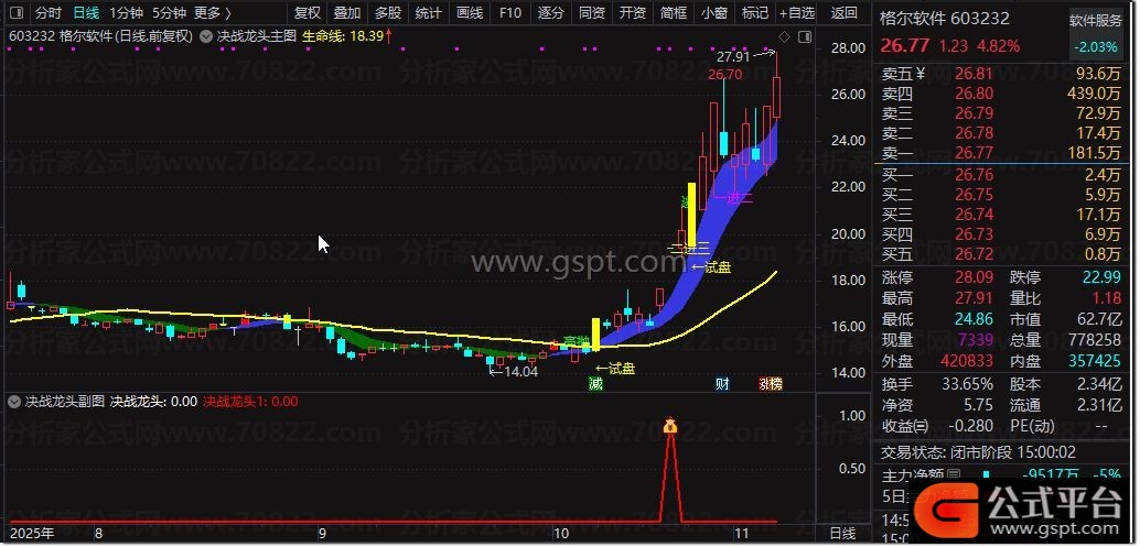 DRAWTEXT(CROSS(gspt10X,0) AND C>=REF(HHV(H,7),1) AND C>REF(C,1)*1.097 AND C=H AND CROSS(gspt4,gspt6) AND C>=gspt4 AND C>O,L*0.98,'←首板')COLORRED;