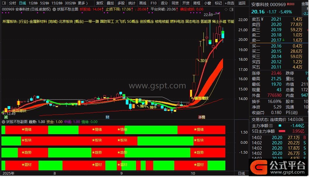 4 主图确定成妖信号出现时,配合副图情绪板块和趋势题材共振走红,形成确定性最高的妖股启动买点