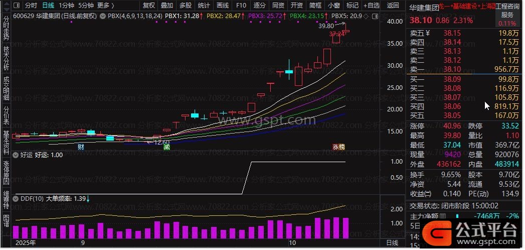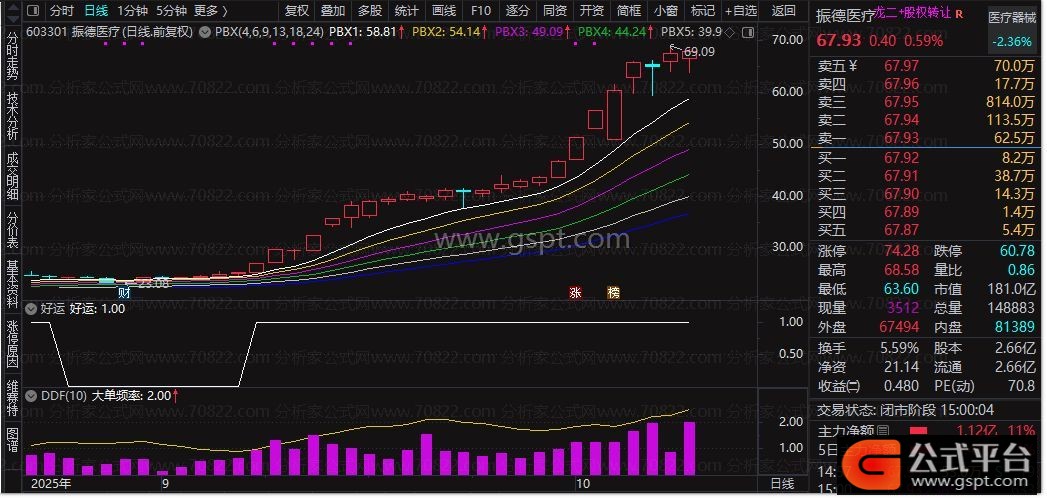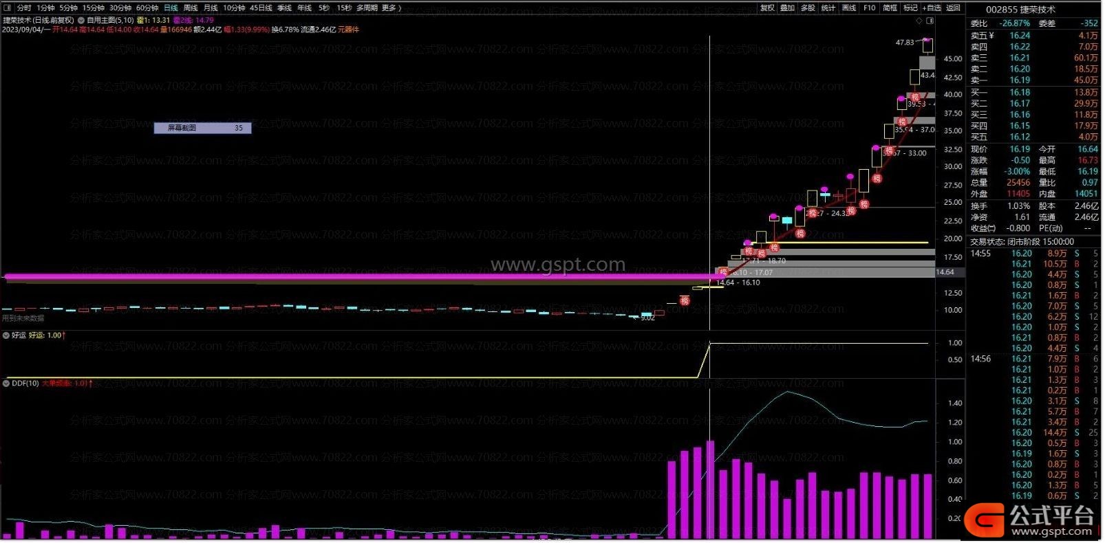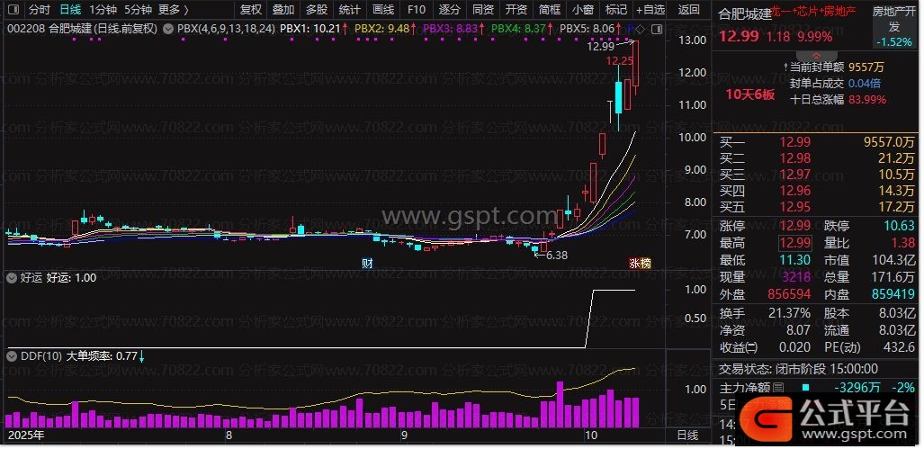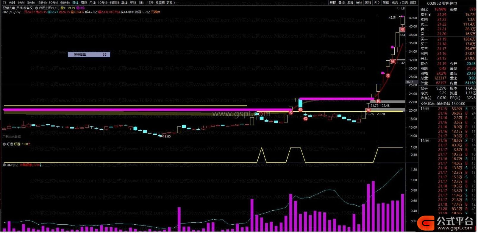 本指标需结合通达信自带的DDF指标(大单频率)共同使用,以判断大牛股是否启动。请注意,DDF指标需开通L2行情方可使用。好运指标与DDF指标配合,基本能捕捉所有真正的大牛股——具备连续涨停潜力的强势股。未体验过大牛股的人,很难理解赚钱快车道的意义。偶尔抓个涨停板并不足以在股市持续盈利,唯有潜心研究,掌握如何用好运指标与DDF指标挖掘大牛股,方能领悟股市赚钱的真谛。