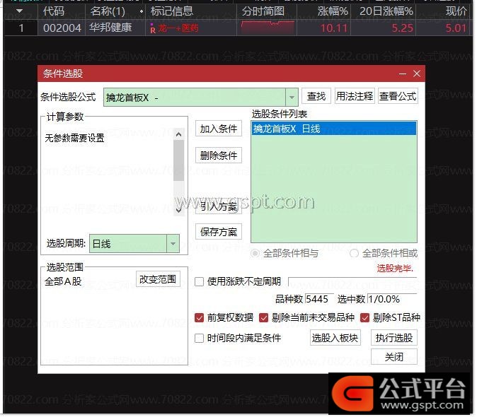 ② 电脑端使用流程:交易日9:25至9:30之间,通过Ctrl+T执行选股,或设置预警,也可使用快捷键.401排序指标为“擒龙首板P”。此时应关注数值为1的个股,若为一字板或开盘过高,则依次观察下一只。手机用户可直接执行选股操作。
