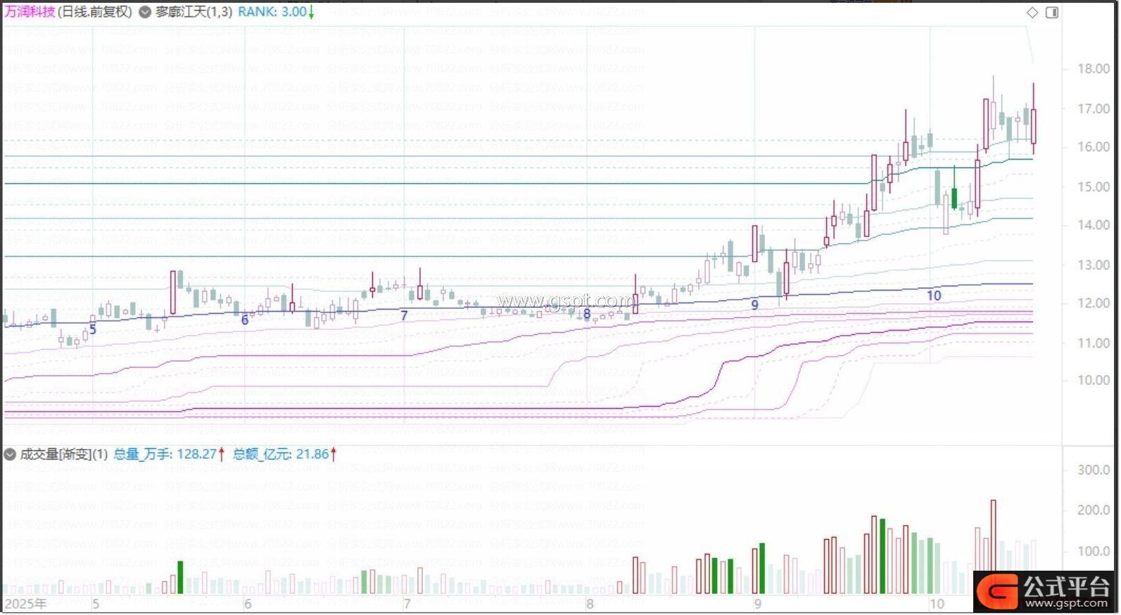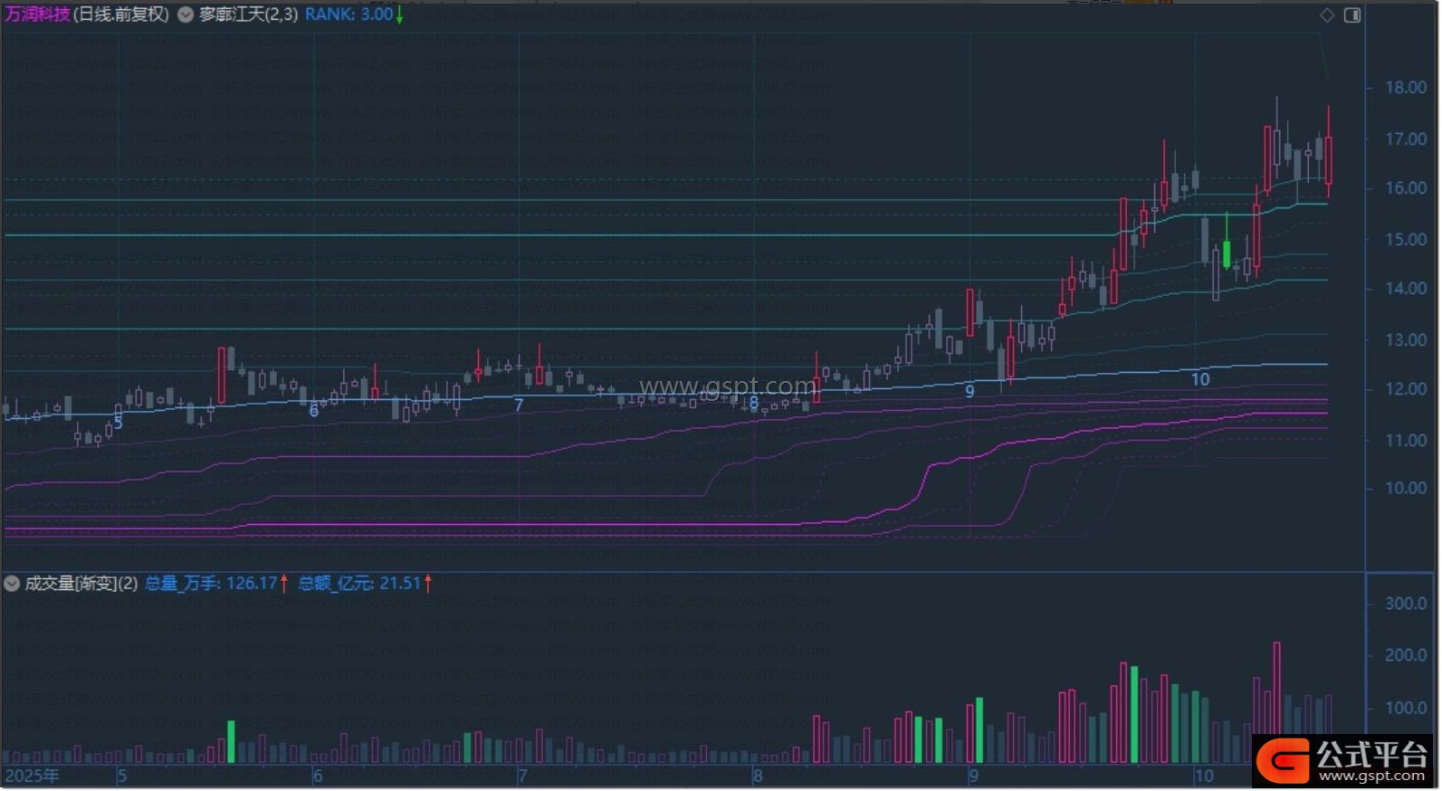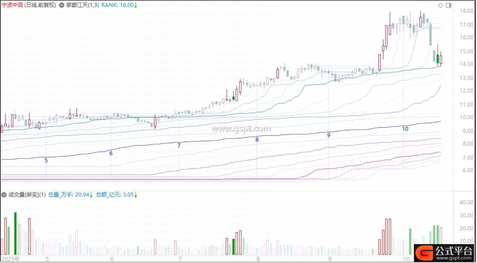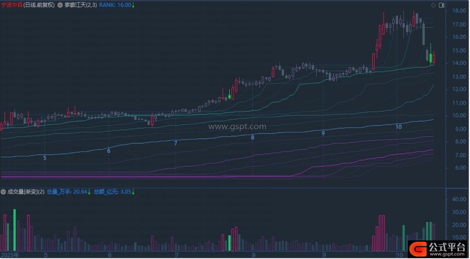 寥廓江天V3.1使用的均分和增减线解决了很多问题,但根据我对中位数排名线的观察,中不溜的排名过于密集,则不必细致切分,反而是靠近HHV和LLV的排名线在中短线波段中相对核心,不应该被过分省略的切割和标注。所以我使用了5-10-15的三阶段均分法,从而实现兼顾短中长线风格的切分模式。