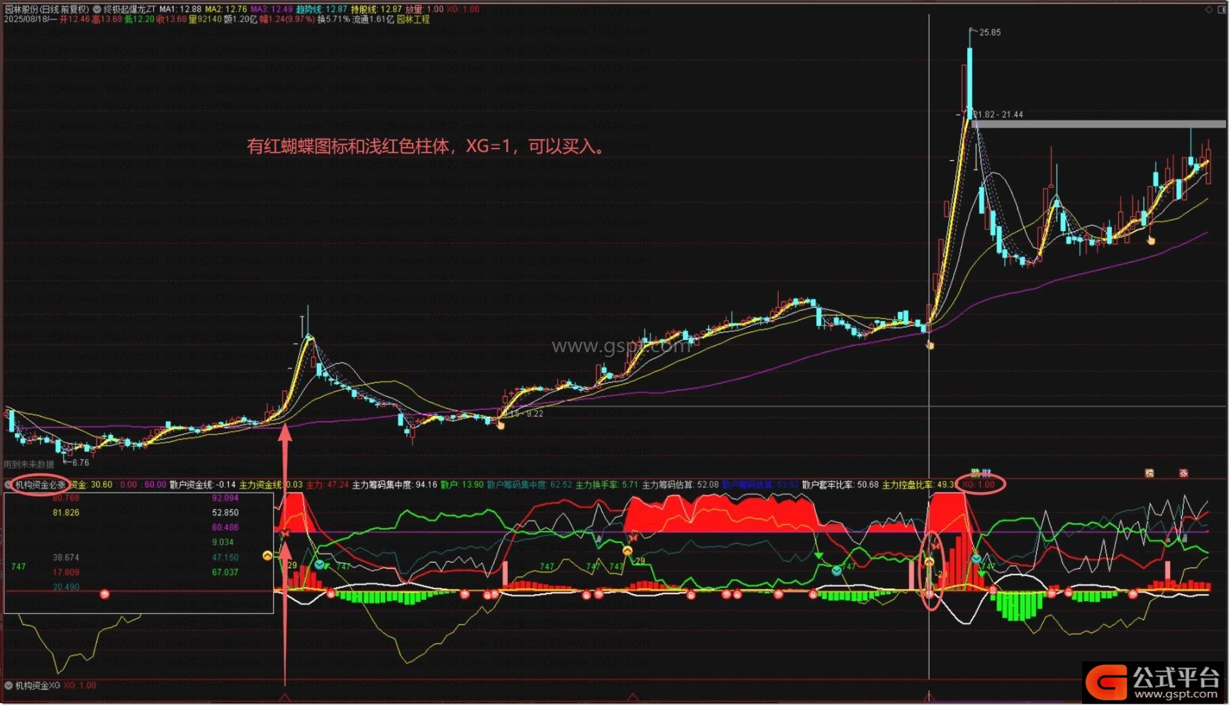 机构资金必涨指标是分析主力筹码和主力控盘的实用副图指标。针对原买入信号不明确的问题,现版本已加入优化买入信号。该指标包含主力与散户资金线、筹码集中度和筹码估算,对看盘复盘和定位买入点参考价值显著。当出现蝴蝶图标与浅红色柱体,且XG=1时,即为买入时机。