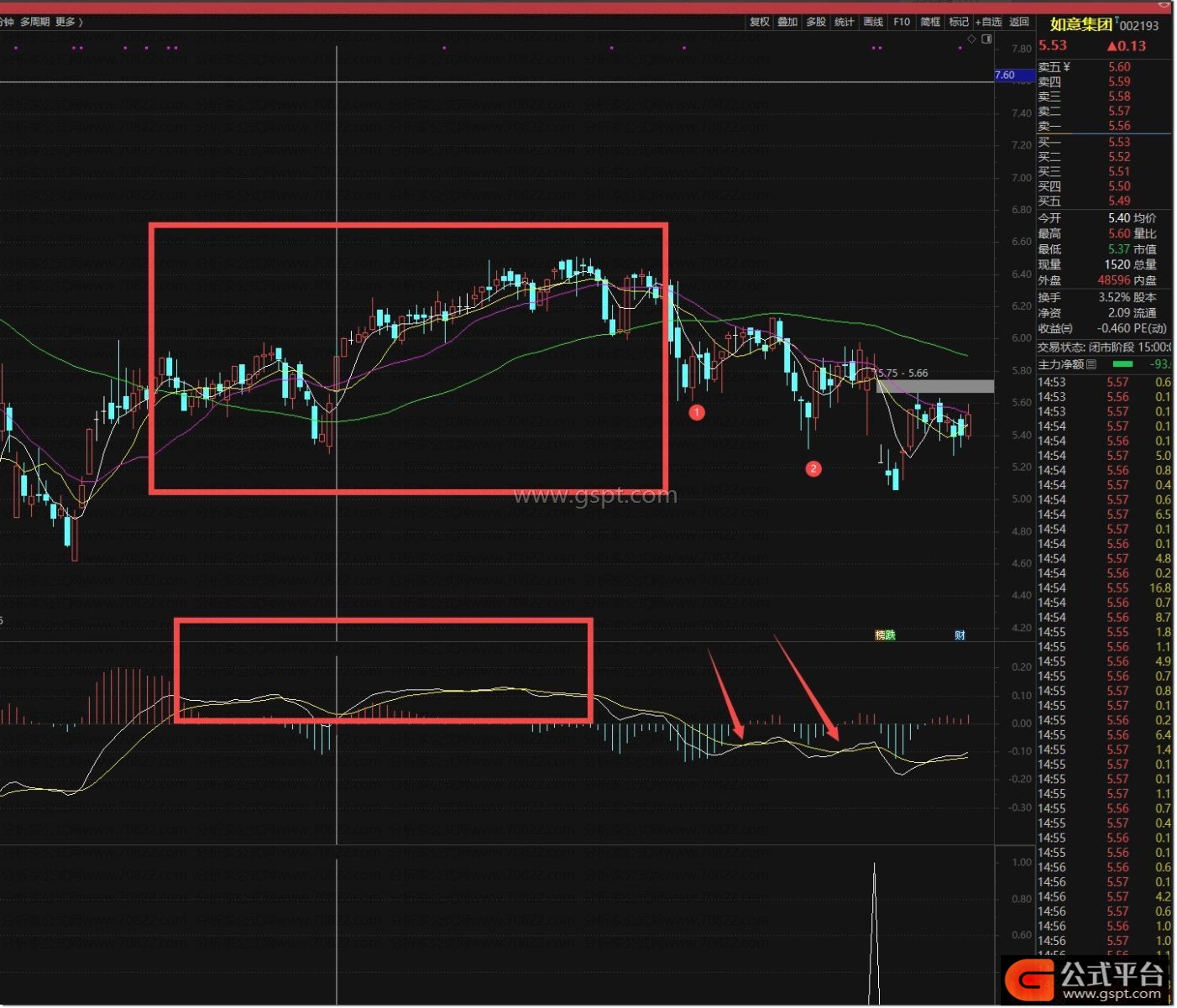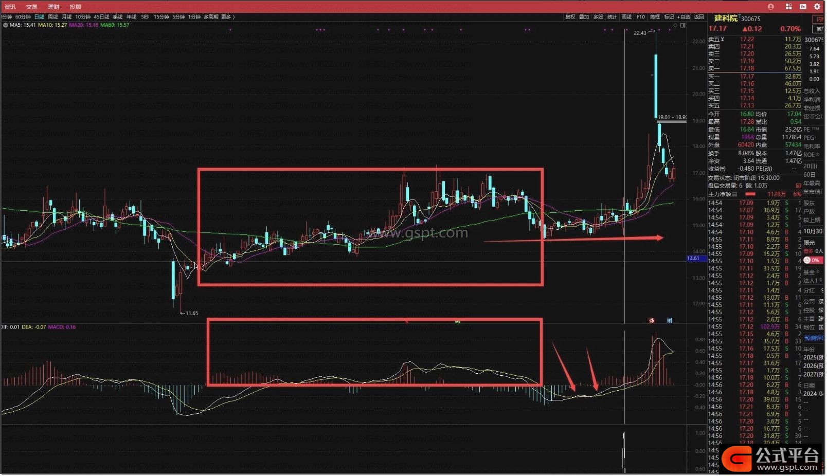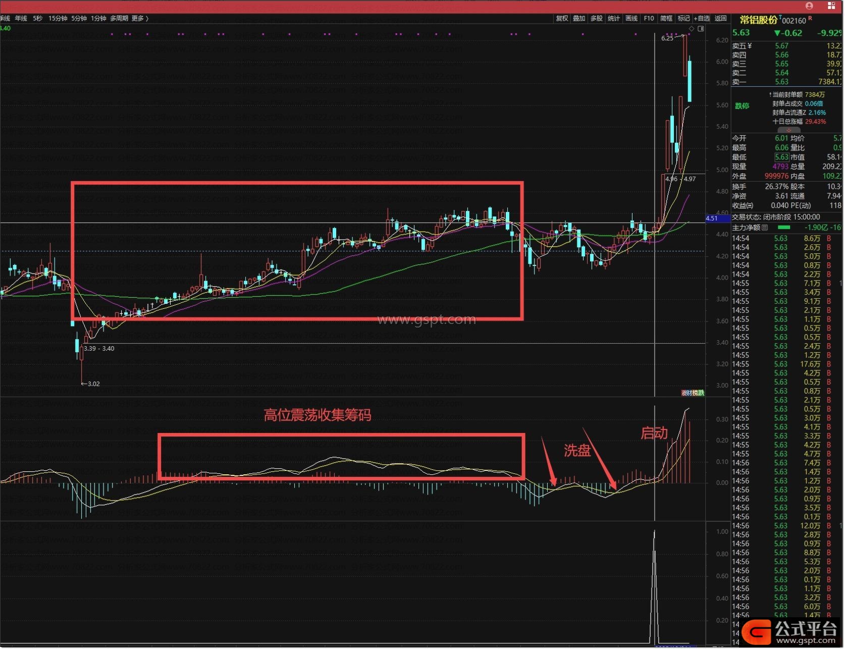 这里高位指MACD指标在零轴之上,称为MACD两条线高位;高位震荡未出现涨停板,而是小阴小阳向上抬升,典型吸筹模式因多头力量大于空头,每次砸盘都有接盘导致;吸筹结束后洗盘,洗盘导致MACD死叉零轴,在零轴下方产生两次或以上金叉,整体不破位也不突破前吸筹高点;进场位置灵活,量化的是第二次金叉后,两条线开口扩大缩小再扩大时进场,选股指标选此位置。