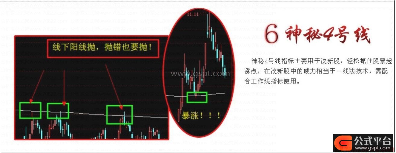 4.神秘4号线:重要的压力位和支撑位(主要用于次新股),次新股的暴涨线