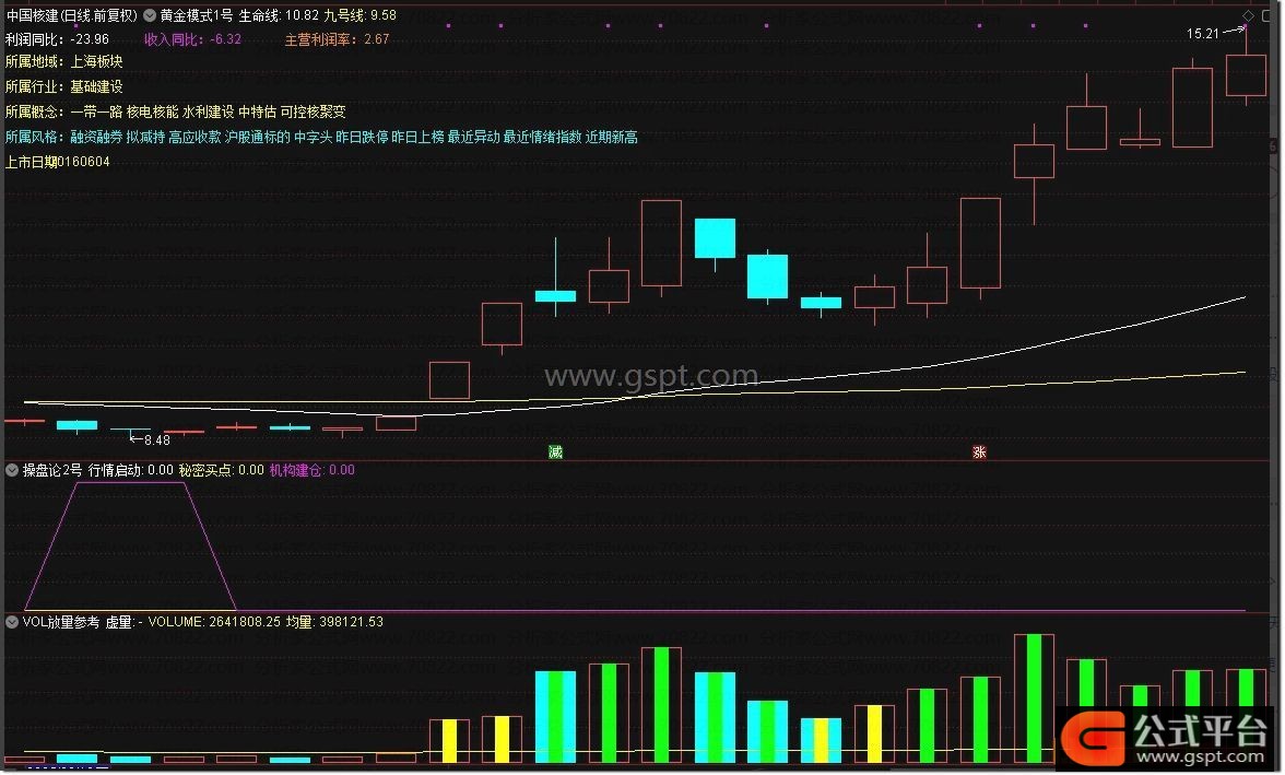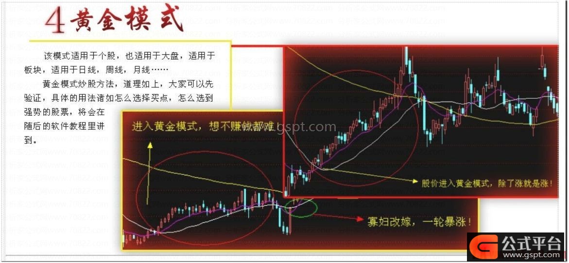 1.黄金模式:顾名思义黄金模式就是与黄金一般值钱,用黄金模式就能赚到真金白银,它由生命线与9号线组成,股价由下向上翻上了生命线表示可以买入持有,碰到9号线先退出,指点机构的建仓区和启动区,散户的精确买点,具有指导趋势的作用,其准无比,让操作者感叹!