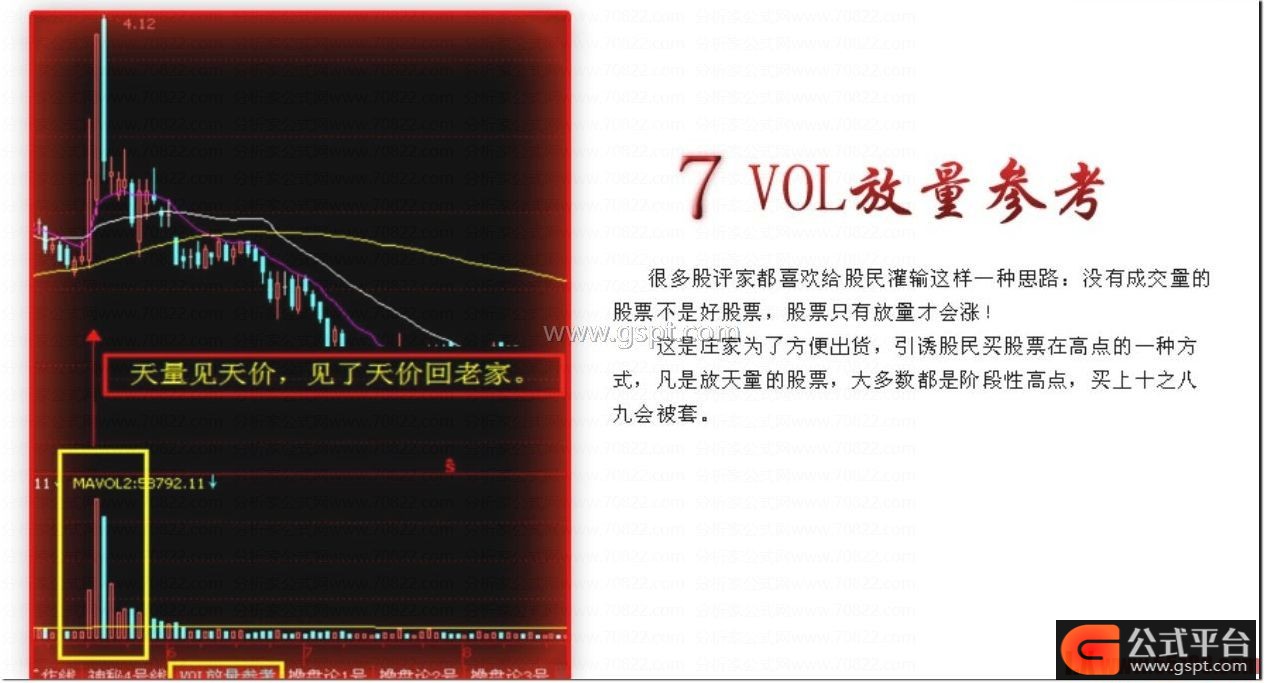 8.VOL放量参考:用来辅助判断个股是否放量(通过软件自动帮您判断什么是大量,什么是天量)以横线为参考依据。