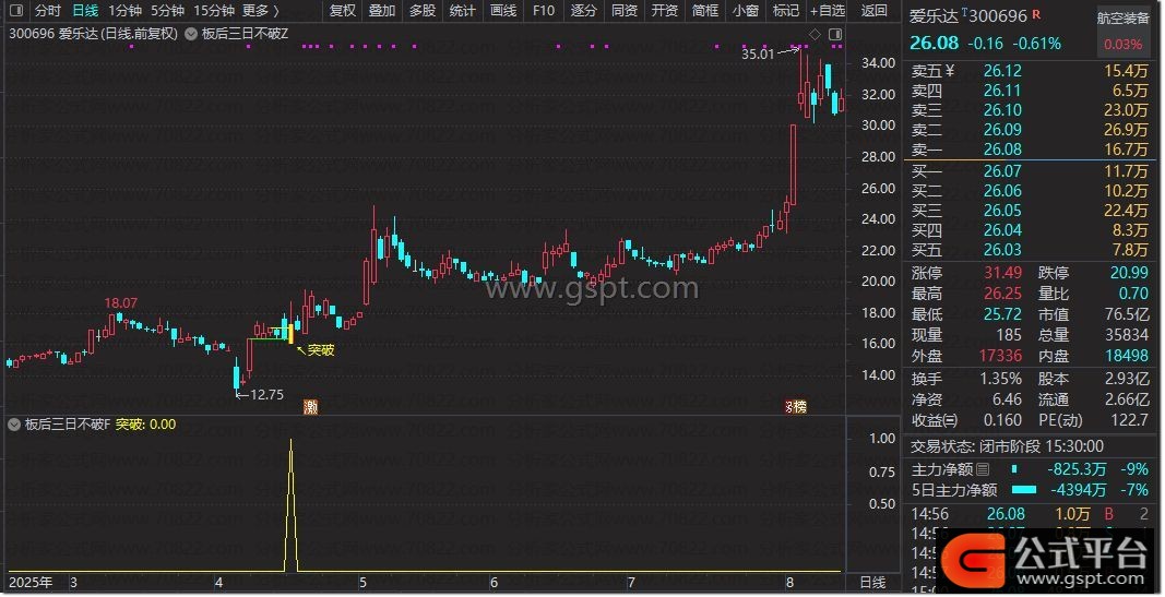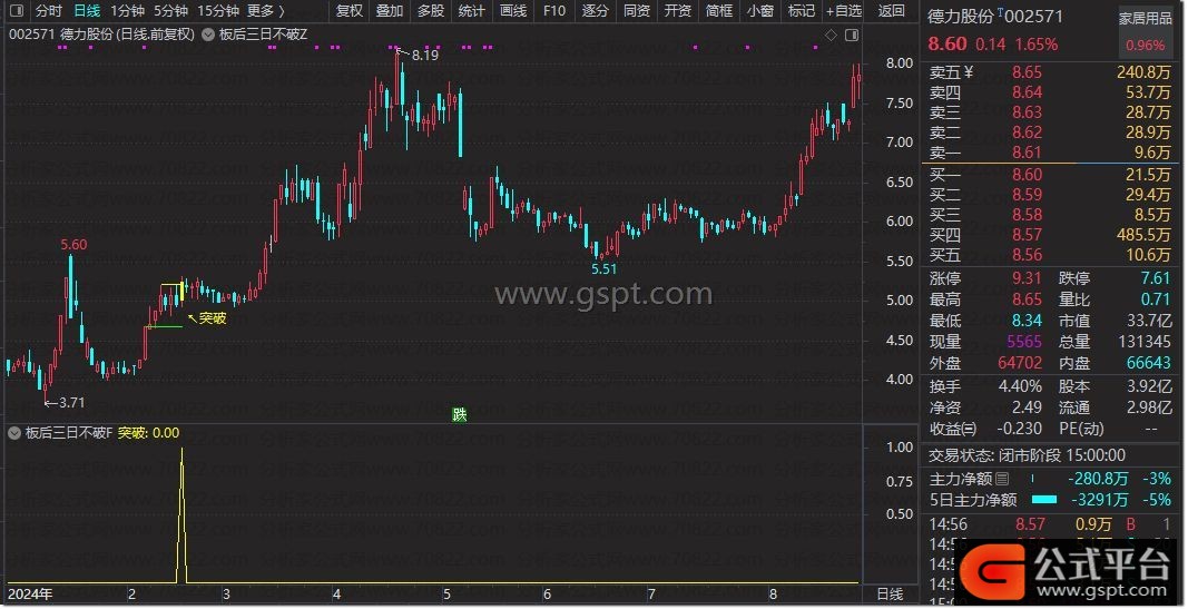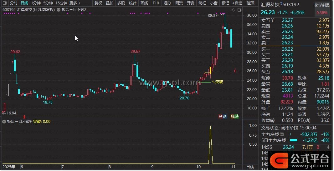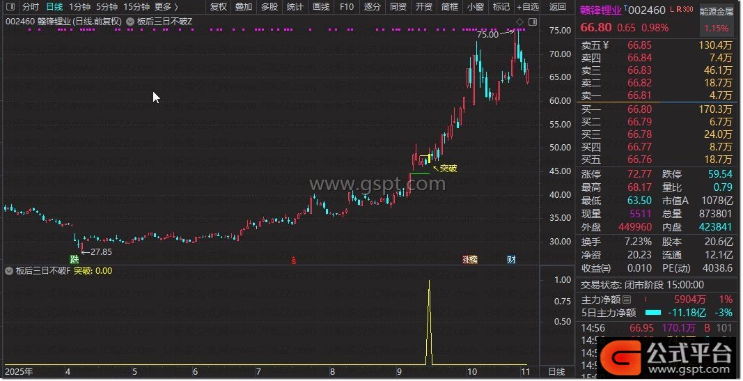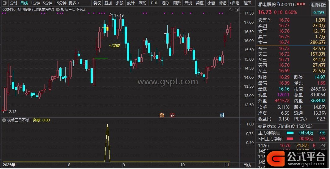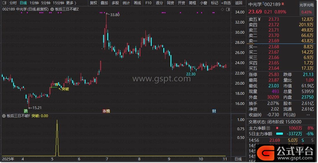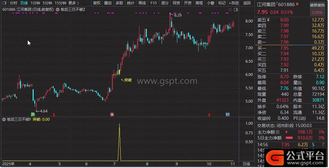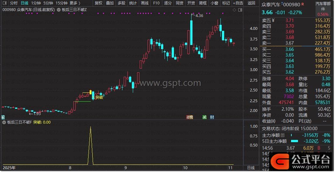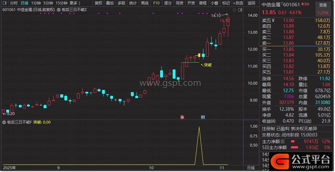 【板后三日不破顶】是一个专门用于捕捉首板后整理突破形态的技术指标,逻辑设计相当精巧:
