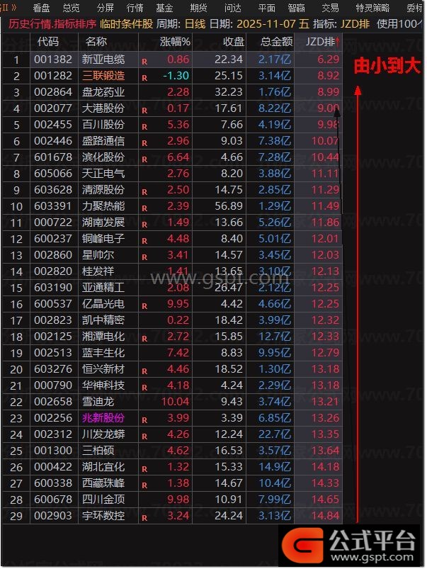 用昨天发布的 的【极致顶格筹码峰】选股后有29个票,再用〖JZD排〗进行排序,得到如下图: