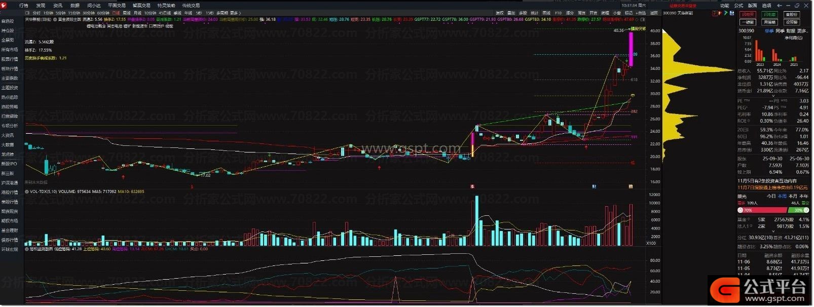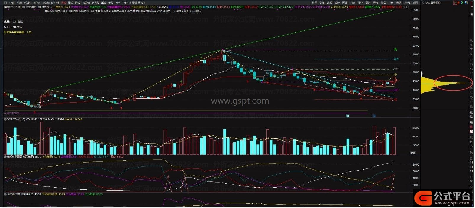 看强势股时,一旦低位筹码线上行,就要密切关注。同时关注主力线和散户线走势,把握强势股启动点。