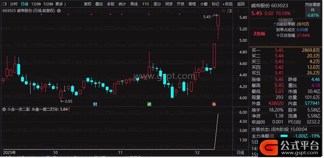 斗金一进二 公式专为短线捕捉个股“一进二”涨停机会设计,核心围绕资金流、涨停结构、量能等关键维度构建评分体系。公式整合了资金净额、资金规模占比、涨停判定、开板识别、量能放大等多维度数据,通过量化计算输出“斗金一进二打分”,数值越高代表个股次日晋级二板的概率越大。