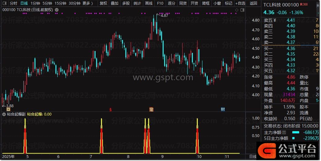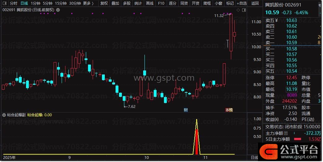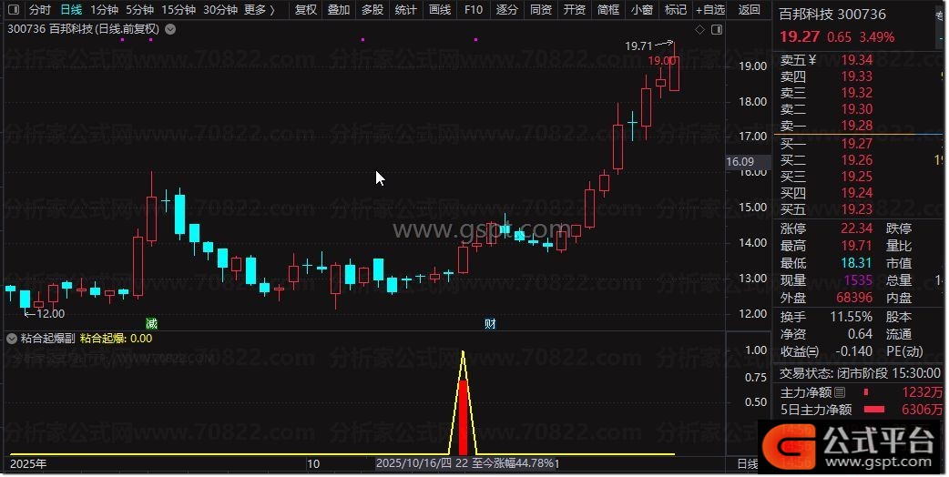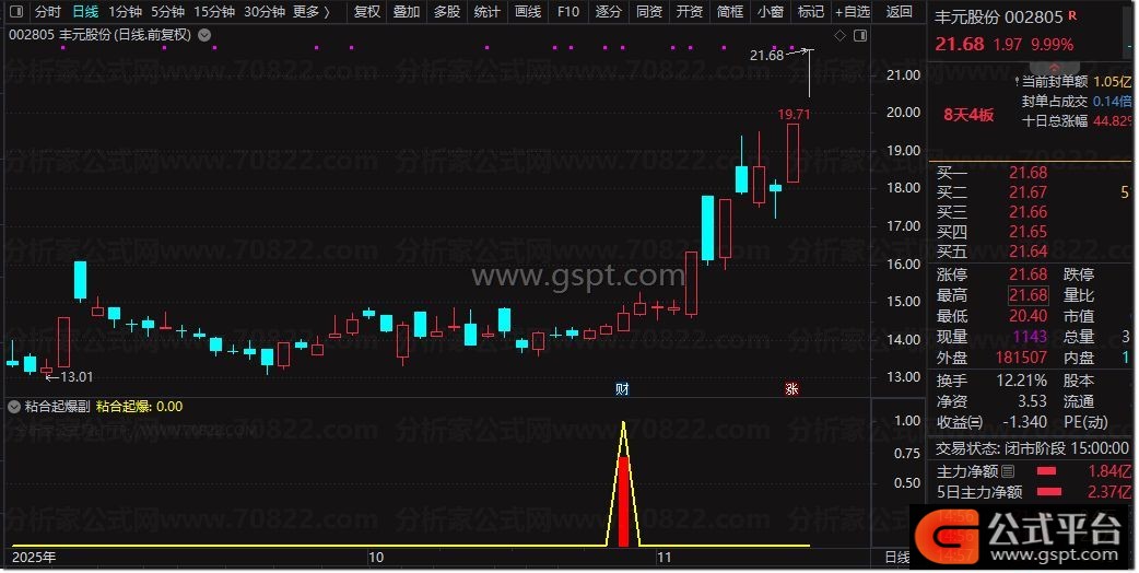 粘合起爆:gspt4 AND gspt7 AND MA(CLOSE,5)>MA(CLOSE,10),LINETHICK2,COLOR00FFFF;