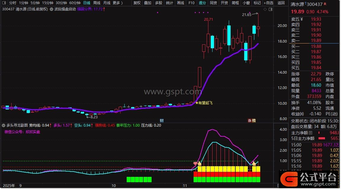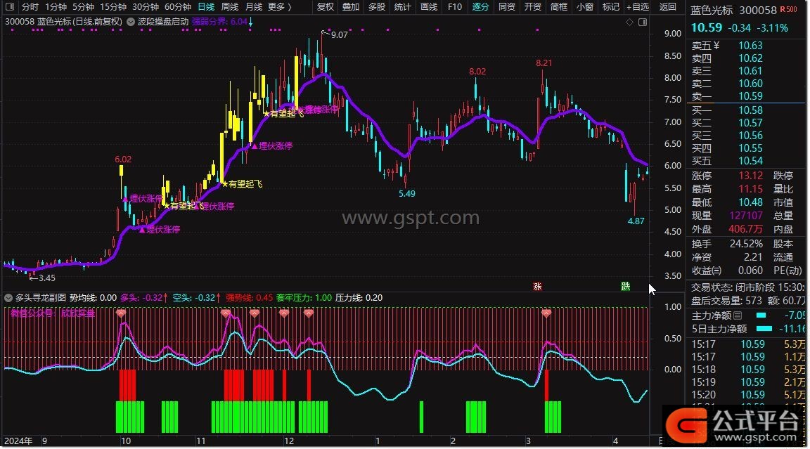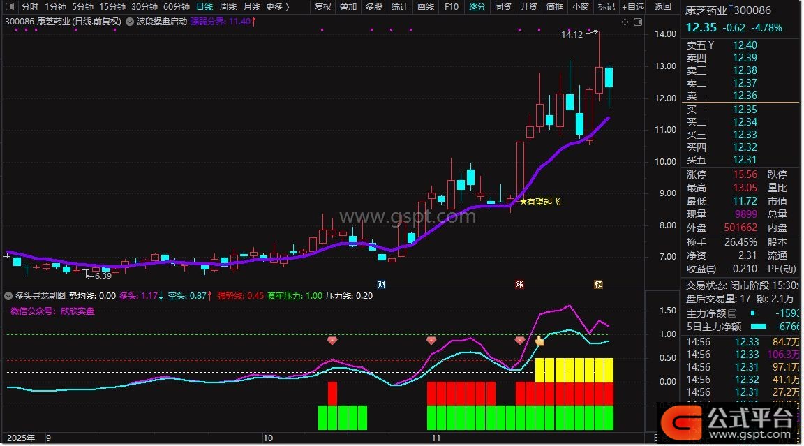 1. 多头寻龙指标能够有效捕捉短期价格波动趋势,过滤市场短期干扰,辅助投资者在不同市场环境下识别多空力量变化,及时把握入场时机。