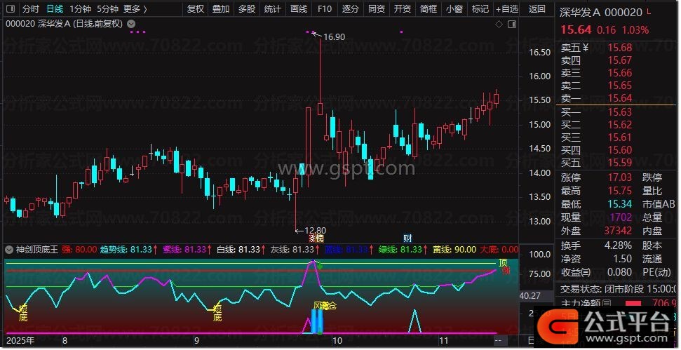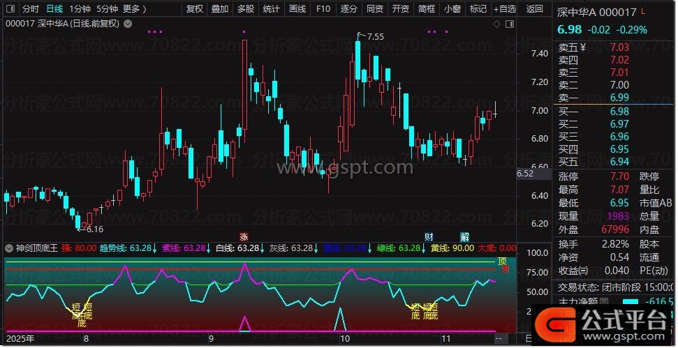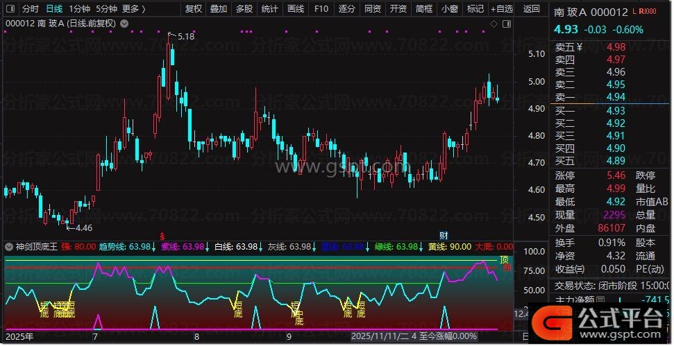 本指标通过计算价格变动率与趋势强度的多重滤波,构建了一套完整的顶底识别体系。核心由六条彩色趋势线组成:紫线(最强)、白线、灰线、蓝线、绿线、黄线(最弱),分别代表不同强度的趋势阈值。当趋势线上穿/下穿关键阈值时,触发相应信号。