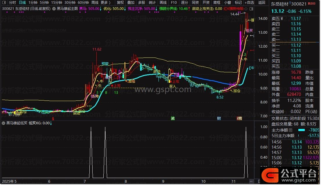 gspt13:=BARSLAST(REF(CROSS(gspt12,gspt11),1)) AND CROSS(gspt11,gspt12) AND C>强弱分界线 AND 强弱分界线>REF(强弱分界线,1)*0.99 AND REF((C-REF(C,1))/REF(C,1)*100,1)< 4 AND (C-O>H-C);