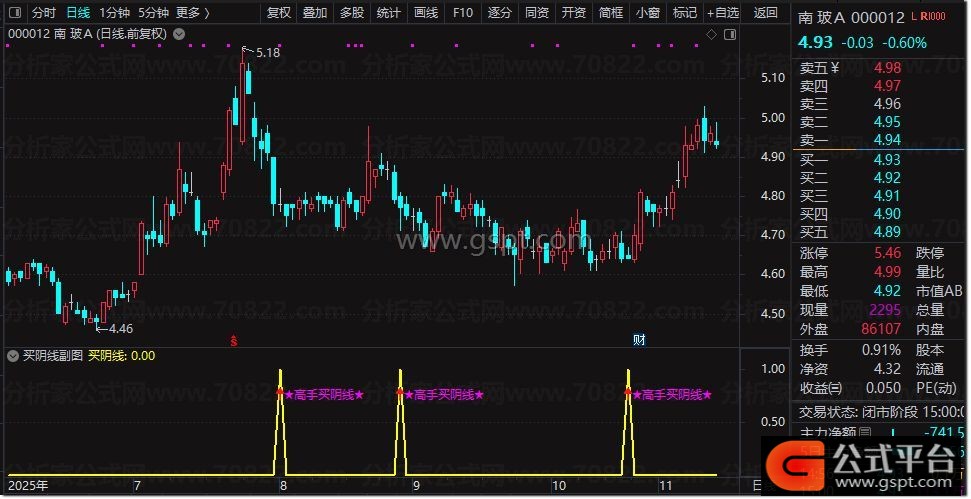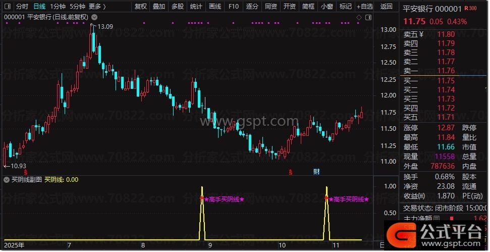 买阴线:REF(gspt12 AND LOW<REF(LOW,1),1),LINETHICK2,COLOR00FFFF;