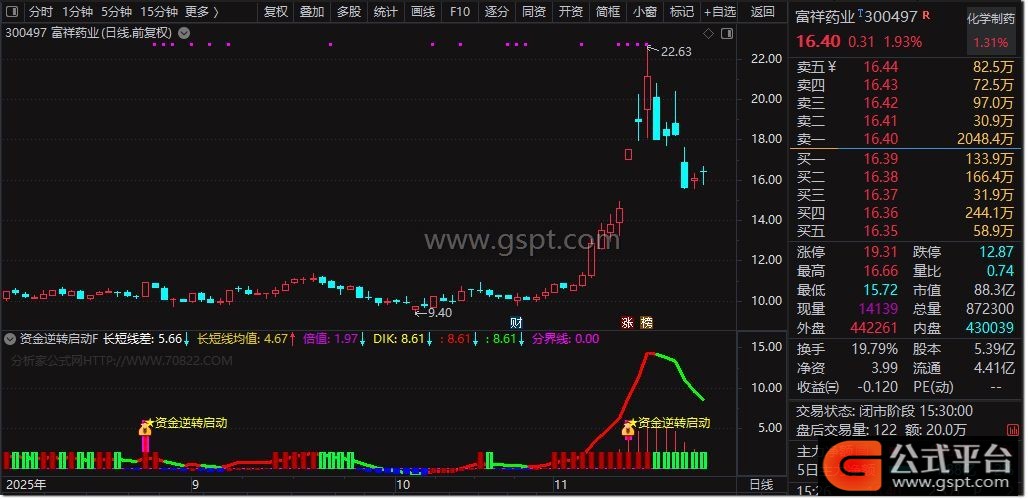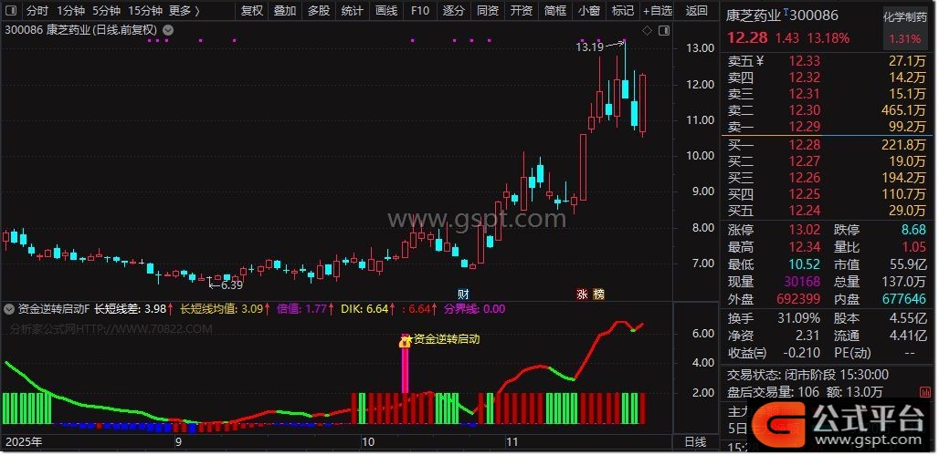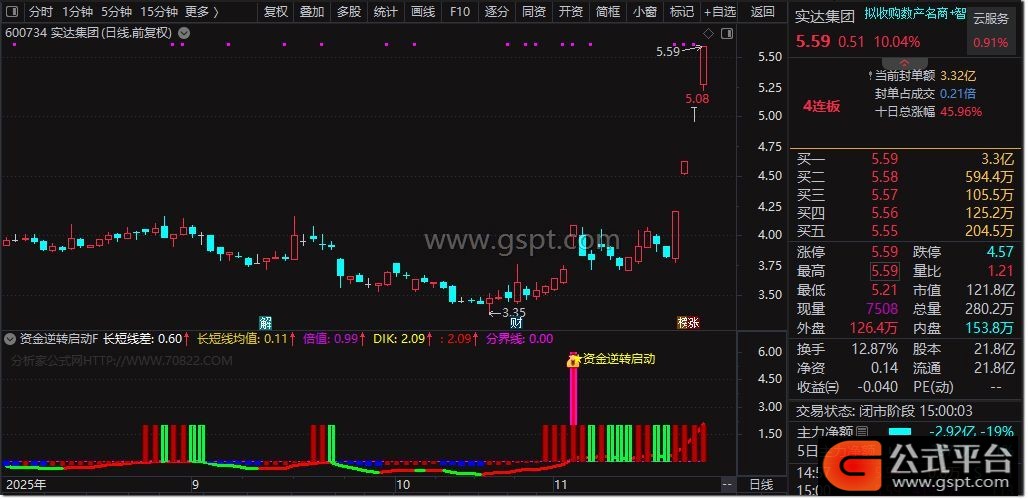 DRAWTEXT(gspt4,5.6,'★资金逆转启动'),COLORYELLOW,LINETHICK6;