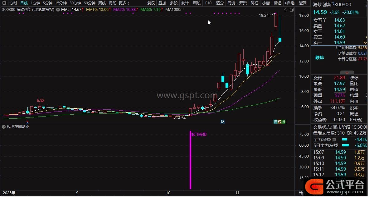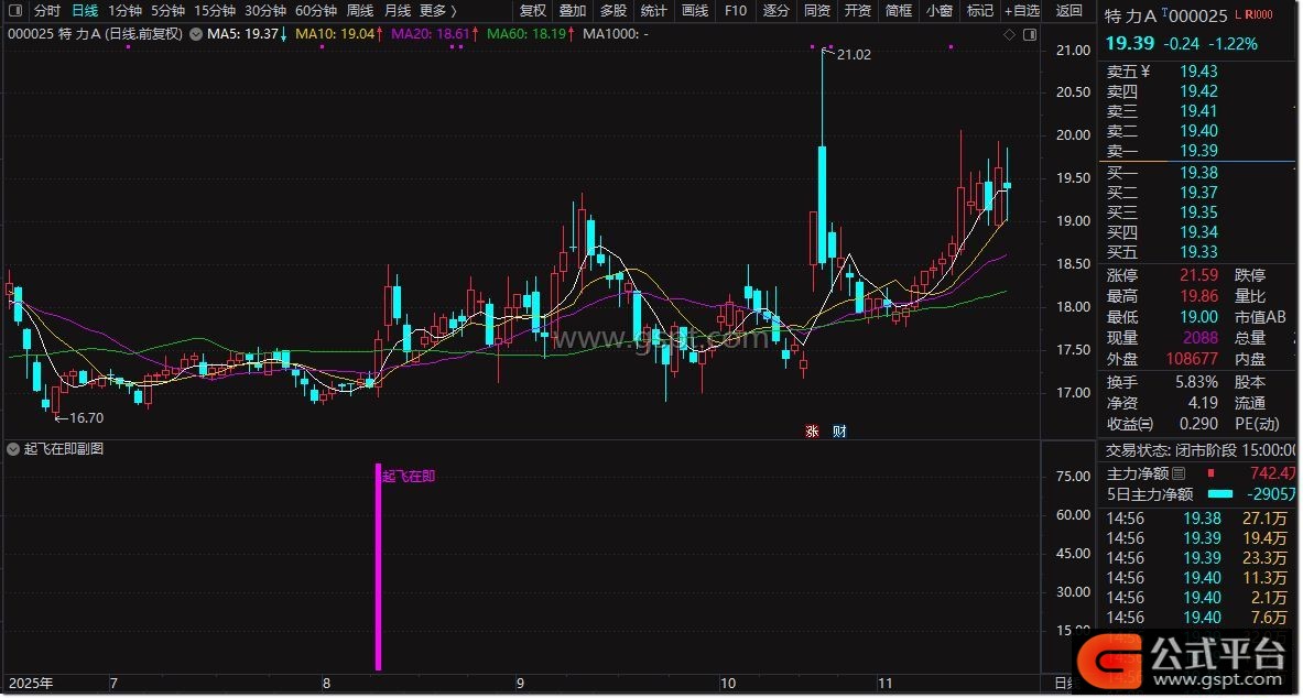 DRAWTEXT(CROSS(gspt20,gspt21) AND gspt20<20,75,' 起飞在即'),COLORMAGENTA;