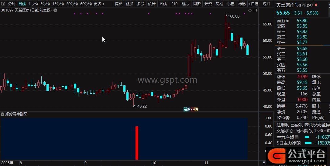 gspt5:=gspt4 AND (MIN(CLOSE,OPEN)-LOW)/(HIGH-LOW)>=1/3 AND gspt2>=3;