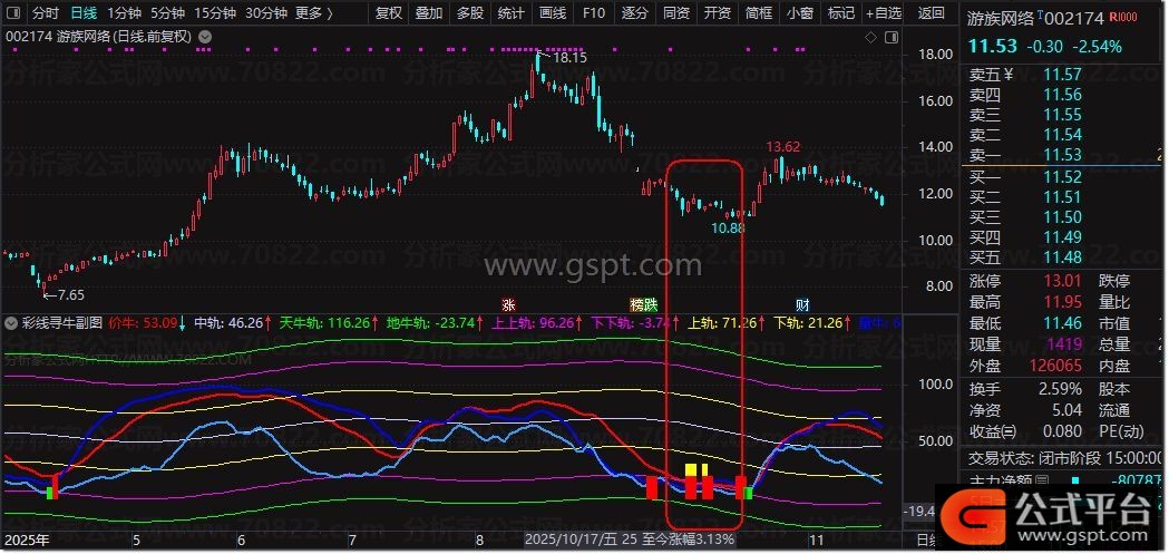 STICKLINE(价牛< 下轨 AND 量牛< 下轨 AND 筹牛< 下下轨 AND 筹牛>REF(筹牛,1),20,0,3,0 ),COLORRED;