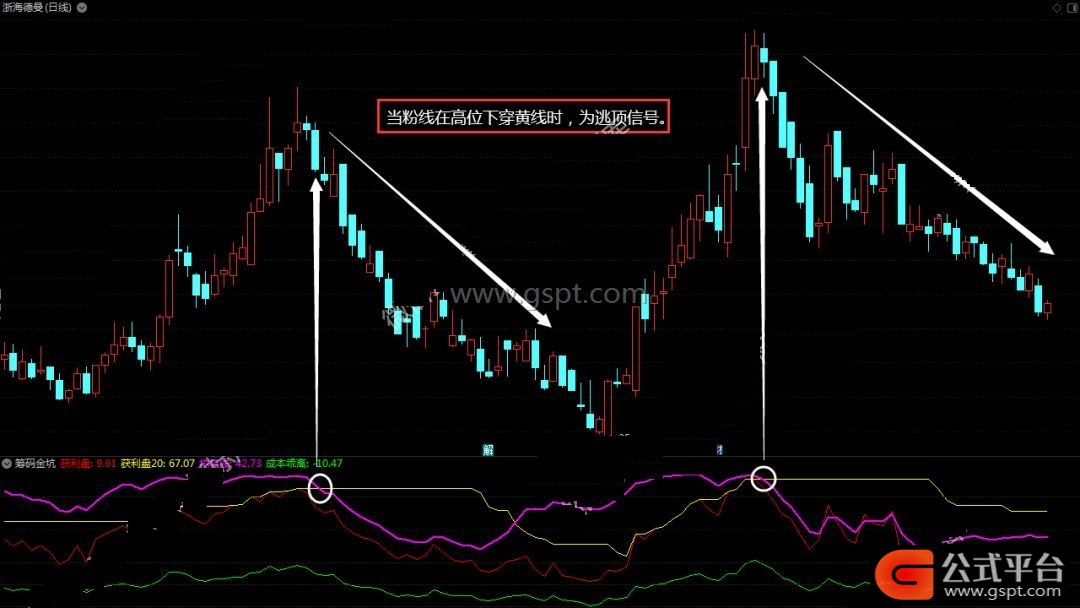 2、顶部预警:粉线高位下破黄线时发出离场信号,提示及时锁定利润。