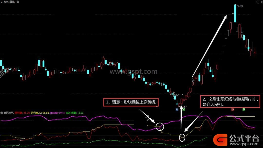 1、黄金买点:粉线低位上穿黄线,红线同步与黄线平行上行,构成最佳右侧买点。