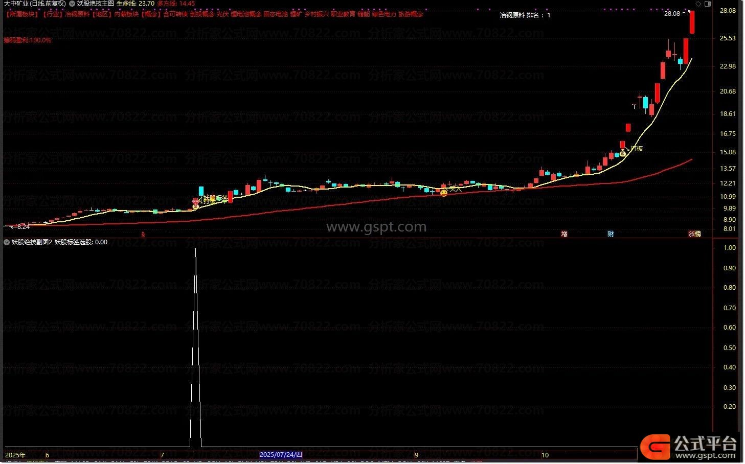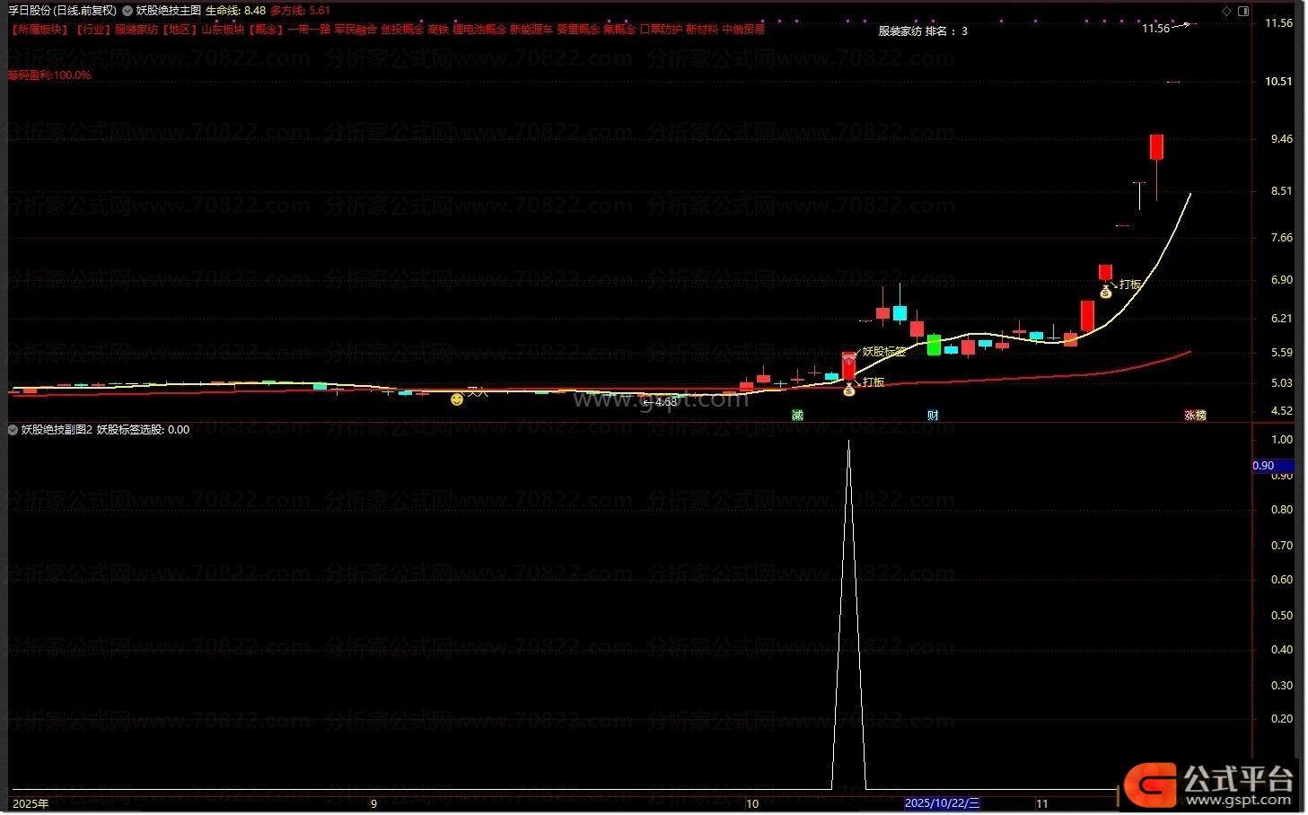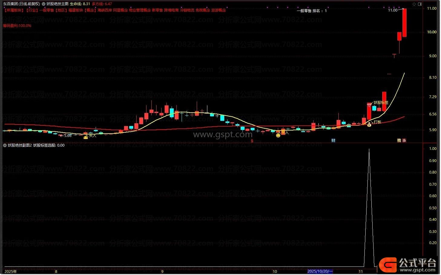 主图指标是一款专注于妖股挖掘、趋势跟踪和买卖信号提示的综合技术指标,适用于通达信软件个股行情界面。核心逻辑围绕价格波动、量能变化、筹码结构、主力控盘和板块属性五大维度,通过多条件组合筛选潜在妖股,同时提供买入、卖出、打板及妖股标签等明确信号,辅助短线交易决策。