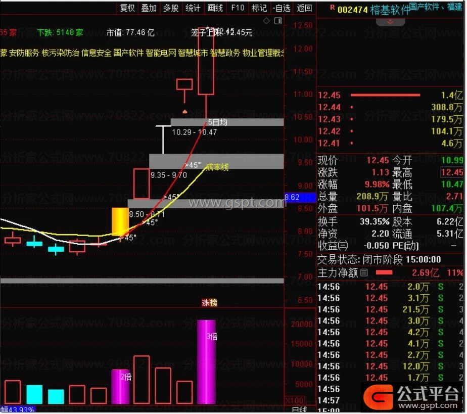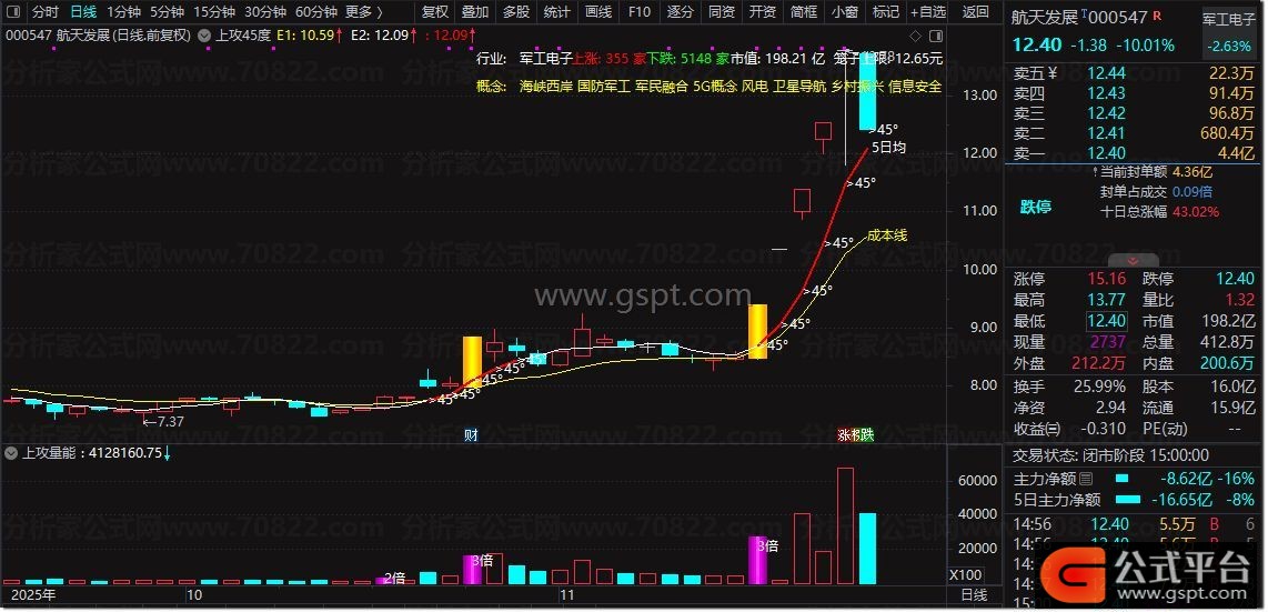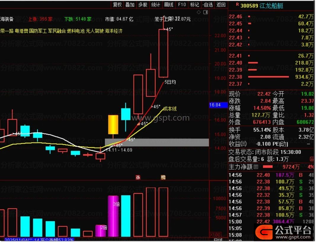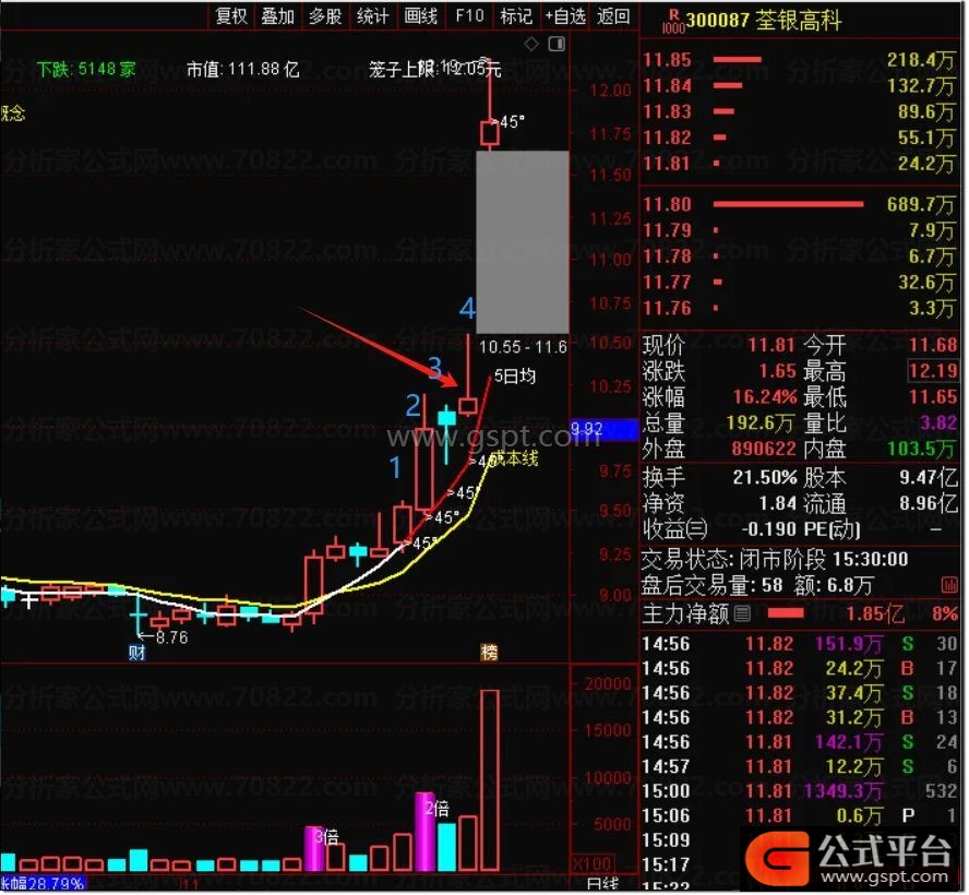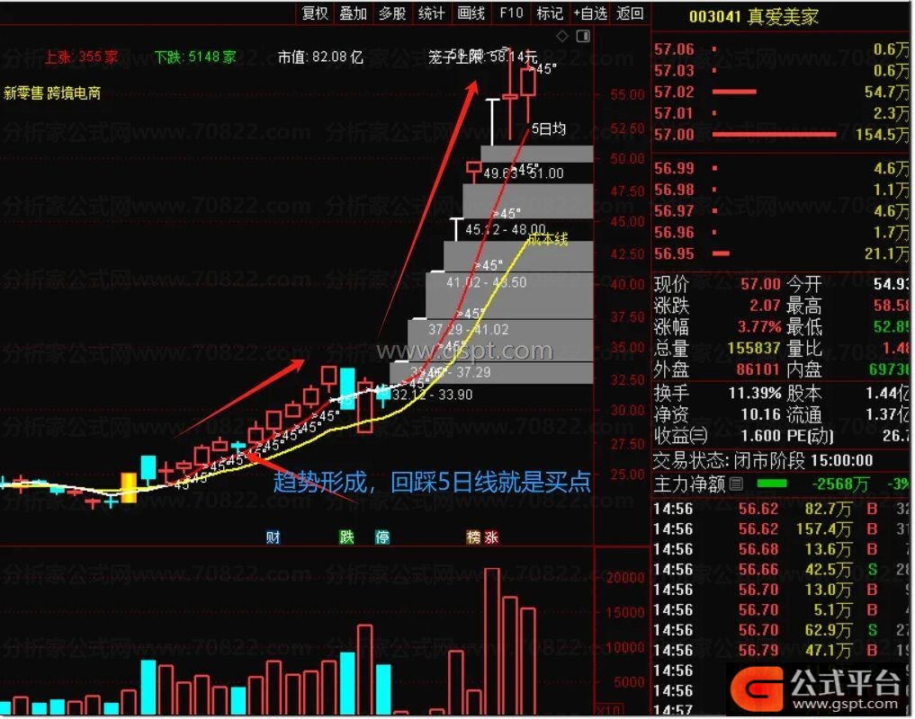 依据股价持续上涨规律总结发现,当上涨角度突破45度,且连续四个交易日维持此斜率,即可确认趋势成立。后续出现回调即是低吸机会,此模式特别适合捕捉趋势股与翻倍牛股。