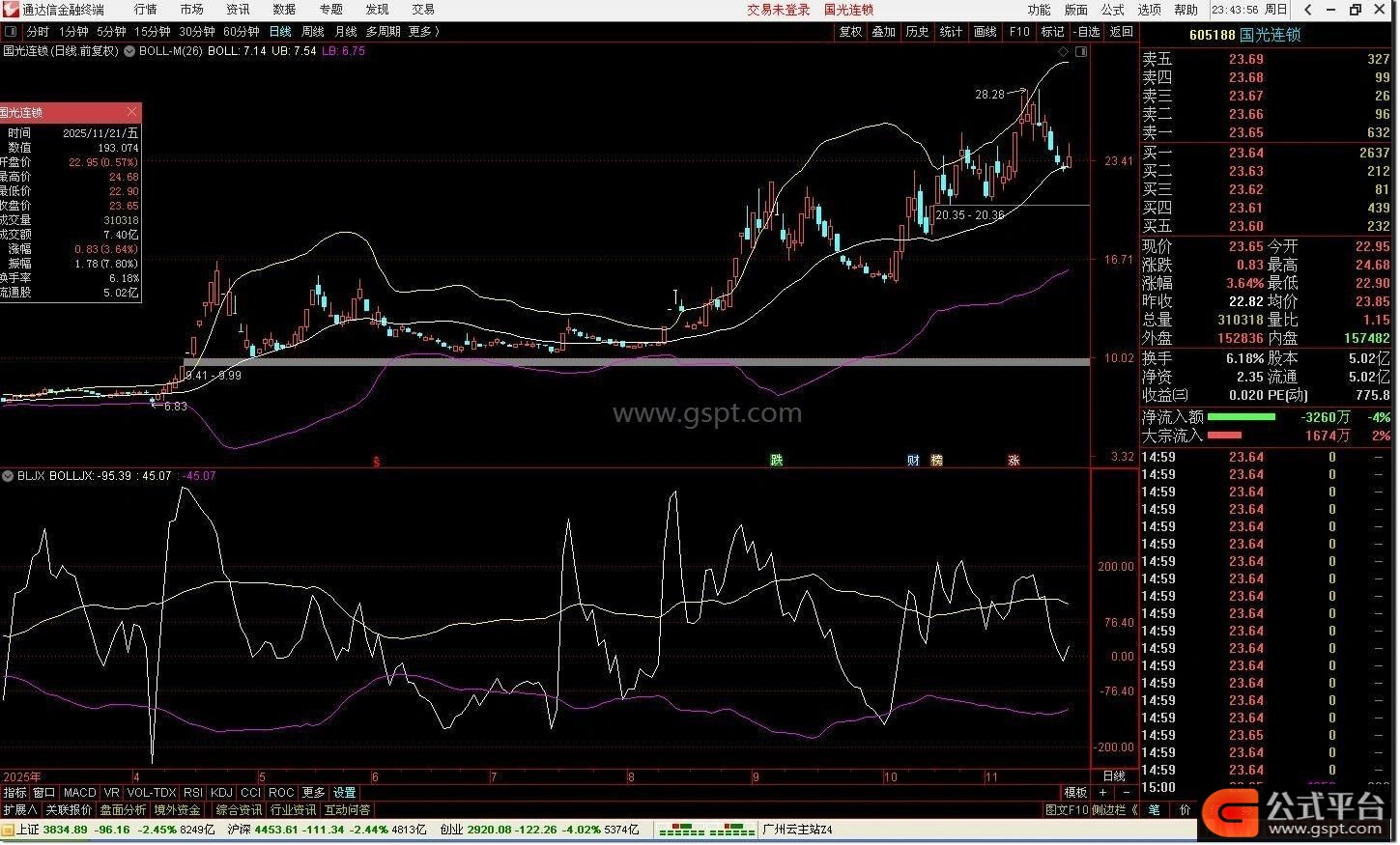 最近看到抖音上指南针新布林极限的图对这种波动进行了累计上下轨并用于分时