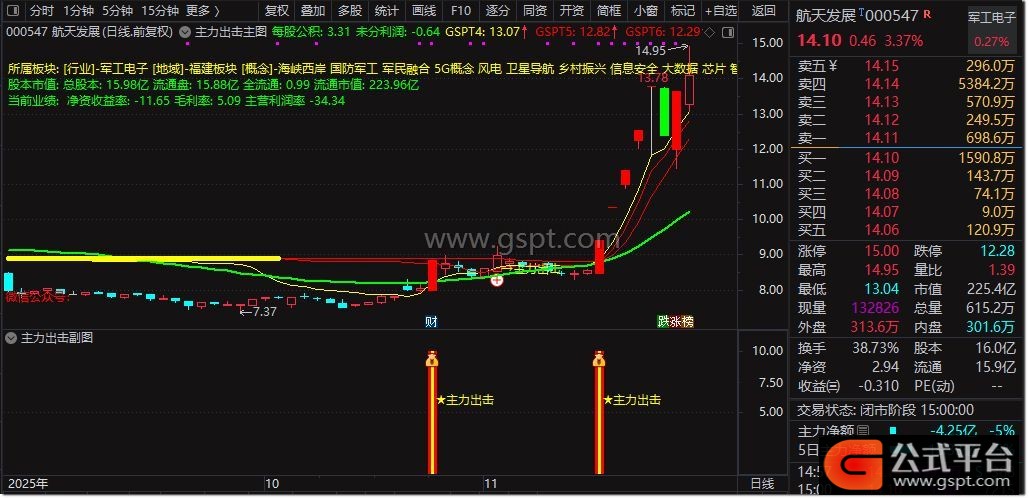 当所有条件满足时,副图显示红色柱状线、黄色“★主力出击”文字及图标,提示关注机会。