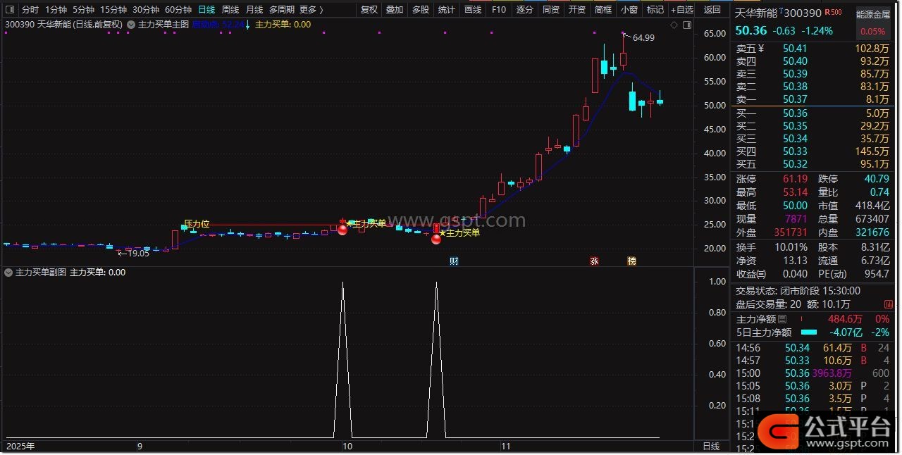指标原理:当个股出现60日最大成交量且换手率适中时,标记为机构买单。随后股价在该K线最高价与开盘价构成的压力位下方震荡整理,待放量突破且创5日新高时,触发主力买单信号。