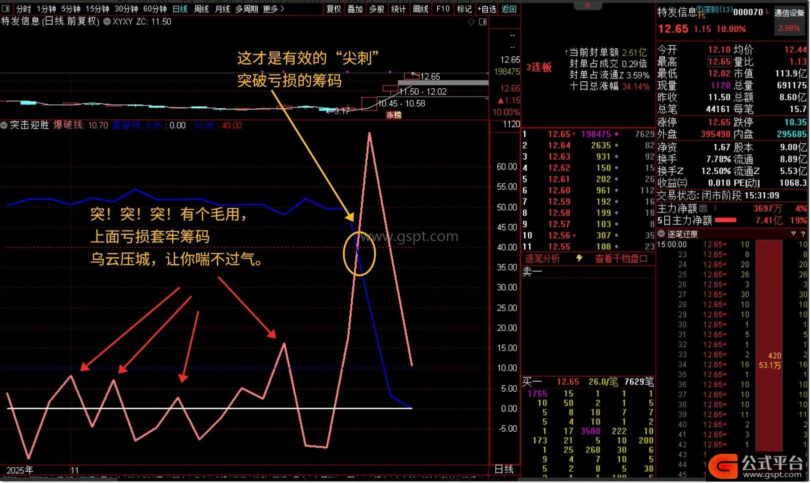 有悟性的投资者还会发现,尖刺公式 刺破亏损筹码后所达到的高度,往往决定了后续股价拉升的高度与连板强度。这背后的逻辑在于,尖刺 本质上就是 浮筹尖峰,其高度直接反映了 主力锁仓 的程度。