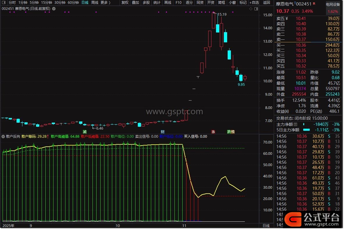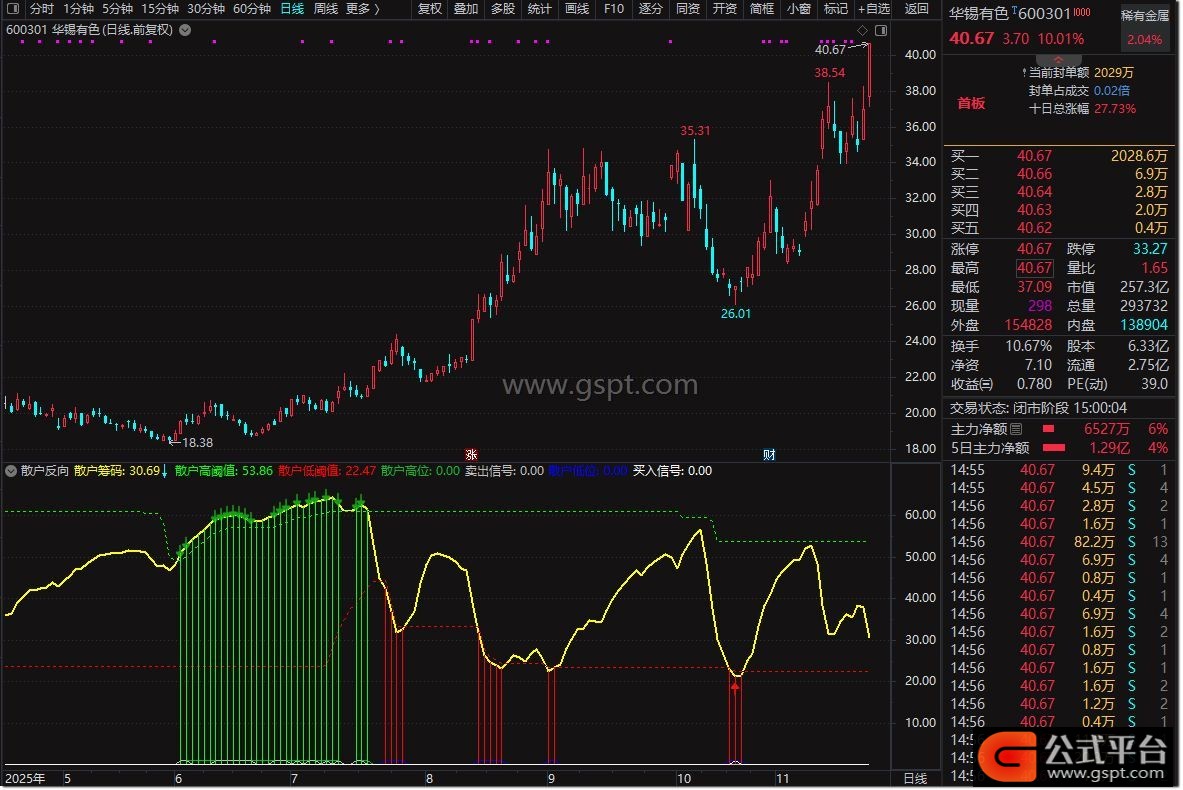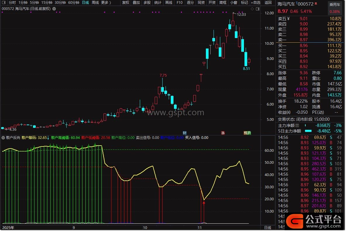 散户反向指标副图工具专为解决散户“一卖就涨一买就跌”的痛点设计,操作时可参考以下核心要素:黄色曲线(散户筹码线)实时反映散户在当前价格附近的持仓密集程度;绿色虚线为近60日散户筹码高位参考线(95%阈值),红色虚线为近60日散户筹码低位参考线(105%阈值)。当出现红色背景区域时,表明散户筹码处于极低水平,可视为潜在买点区域;绿色背景区域则显示散户筹码处于极高水平,对应潜在卖点区域。具体信号标识方面,↑图标代表满足“散户割肉+缩量阳线”条件,触发反向买入信号;↓图标代表满足“散户追高+滞涨或放量”条件,触发反向卖出信号。该指标无未来函数,保持原始数据真实性,适合短线交易者作为辅助参考工具。