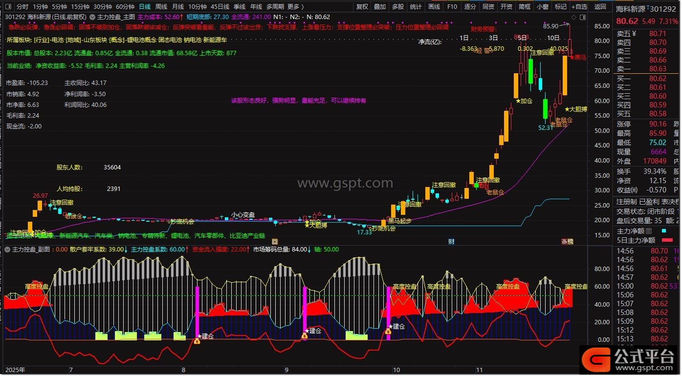 买入时机:主图出现黑马起步或黑马信号,同时副图主力控盘系数大于50、资金流入强度为正,结合财务预警无警,可重仓介入;