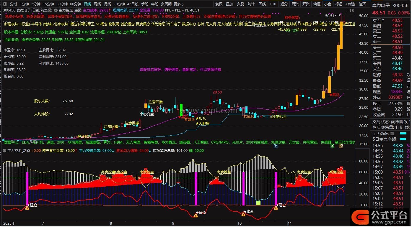 持股与止盈:股价沿主力成本线上行、副图控盘系数维持高位时,可继续持股;