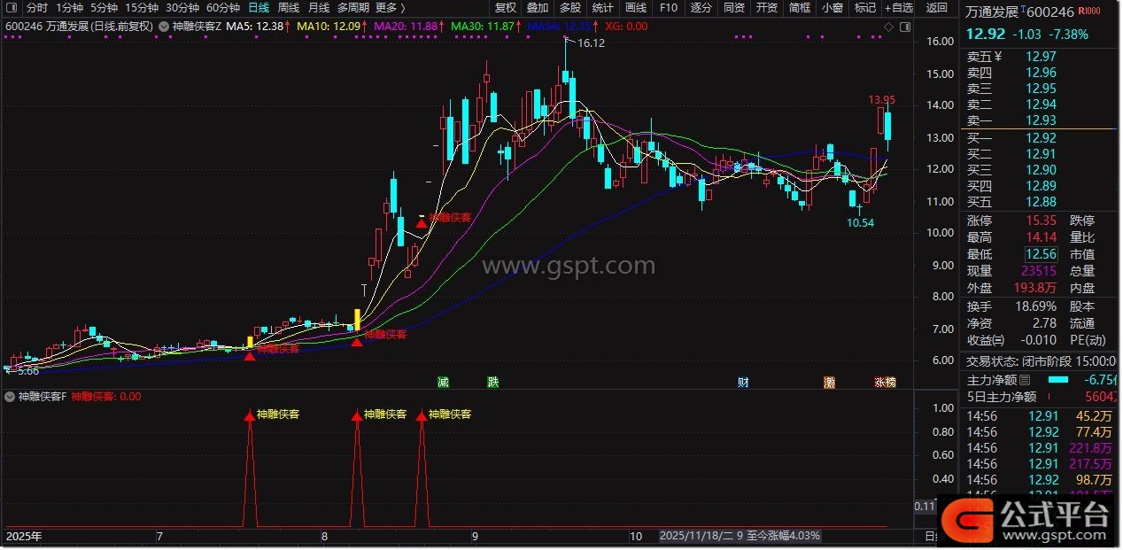 当满足全部技术条件时 K线图显示黄色实体 低位区域出现神雕侠客文字标识 同时以红色箭头精准标记买入点位