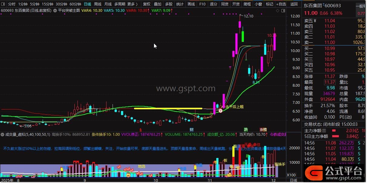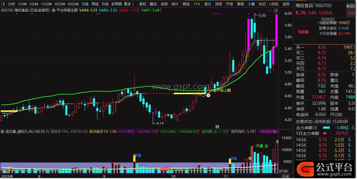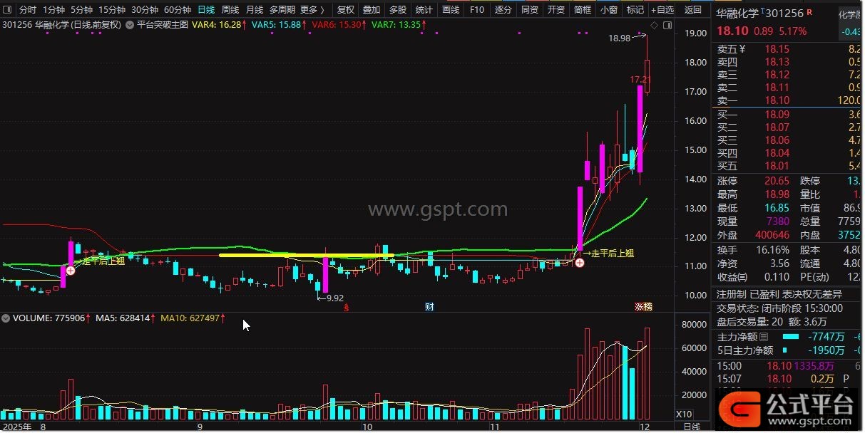 DRAWTEXT(CROSS(VAR4,VAR5) AND C>VAR7,LOW*1.01,' →走平后上翘'),COLORYELLOW;