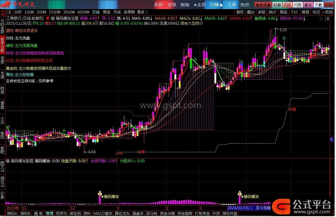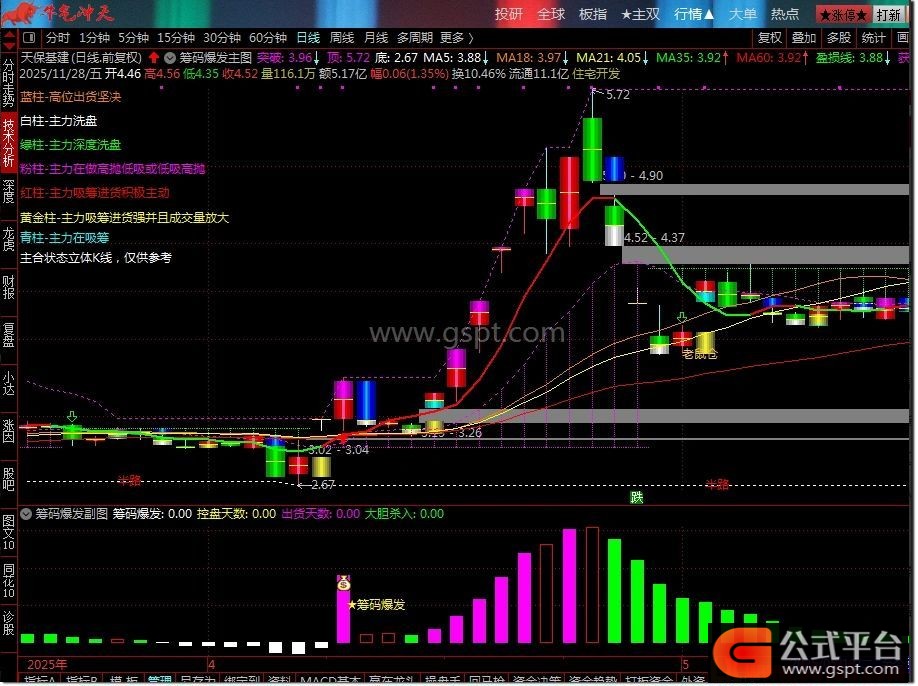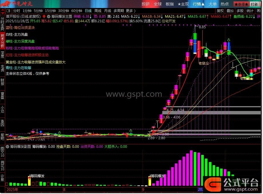 筹码爆发是通达信平台专业追踪主力资金动向的精品指标,独创"控盘度+筹码分布+趋势验证"三维分析体系。通过双重EMA算法精准计算主力控盘程度,实时显示白色(无庄)、红色(有庄)、绿色(出货)、粉色(高度控盘)四种状态,让庄家轨迹无处遁形。