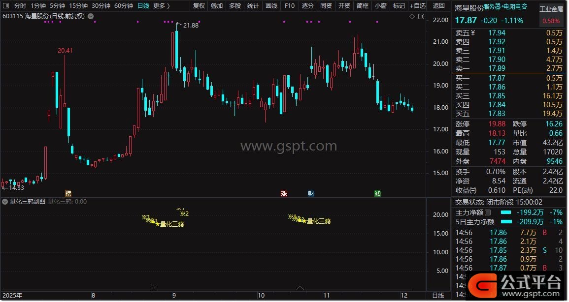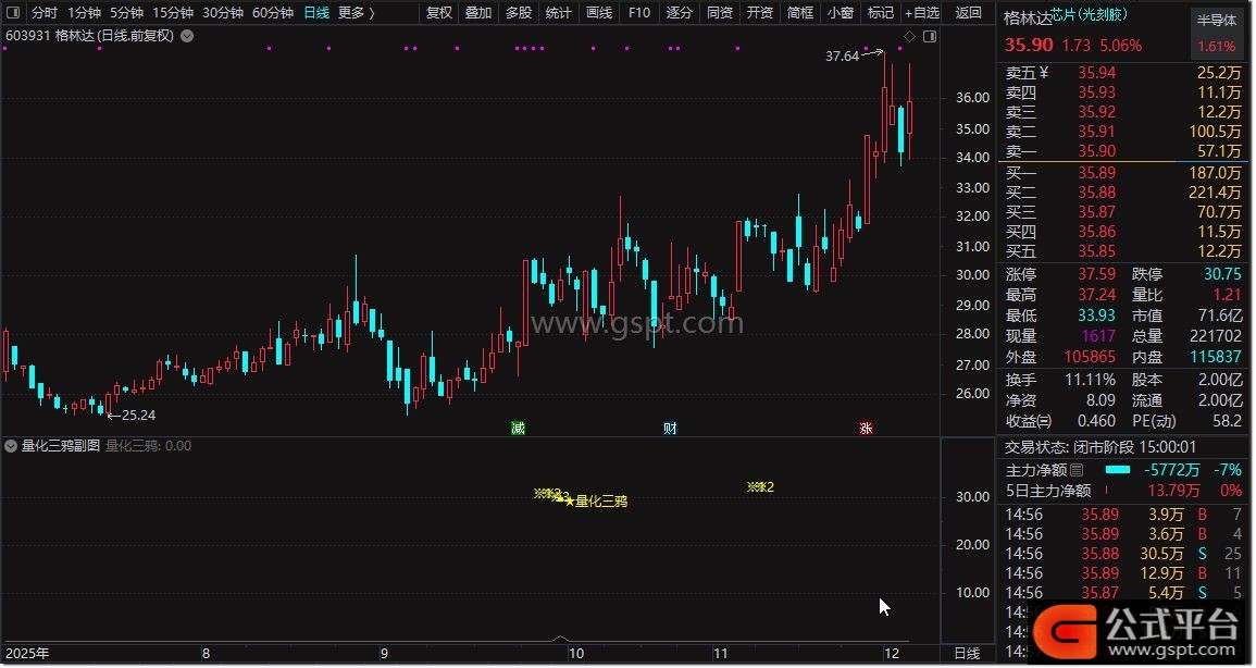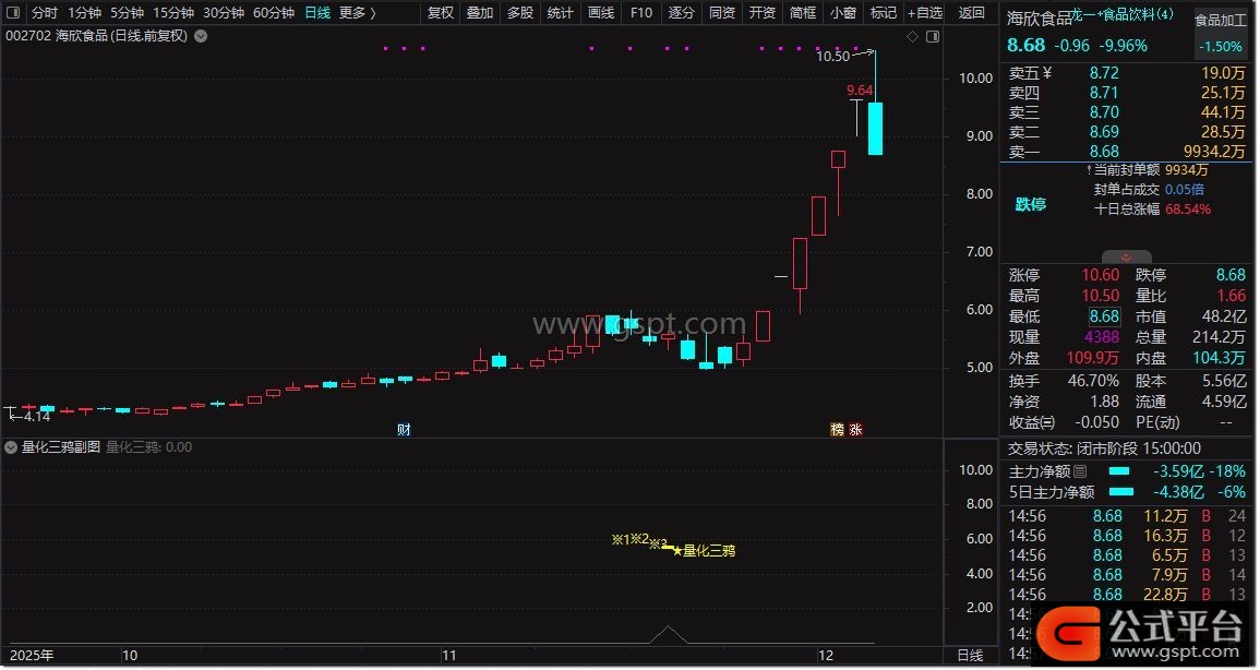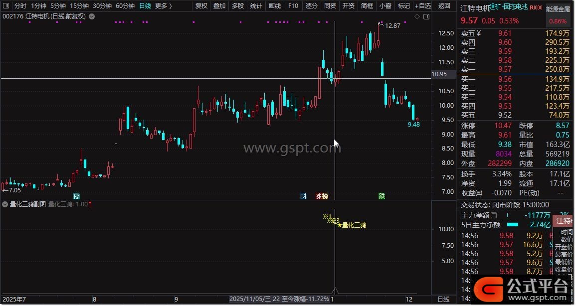 使用场景方面,本指标信号输出频率较低,适合尾盘时段决策使用。尾盘阶段K线形态基本定型,可规避盘中波动导致的信号误判,提升交易决策准确性。量化三鸦形态识别需关注首板后三连阴调整的持续性与站稳阳线的确认性,结合成交量变化可进一步增强信号可靠性。
