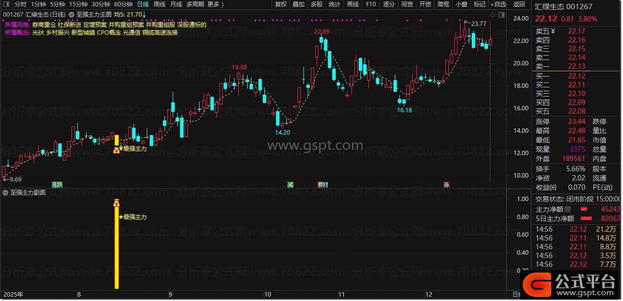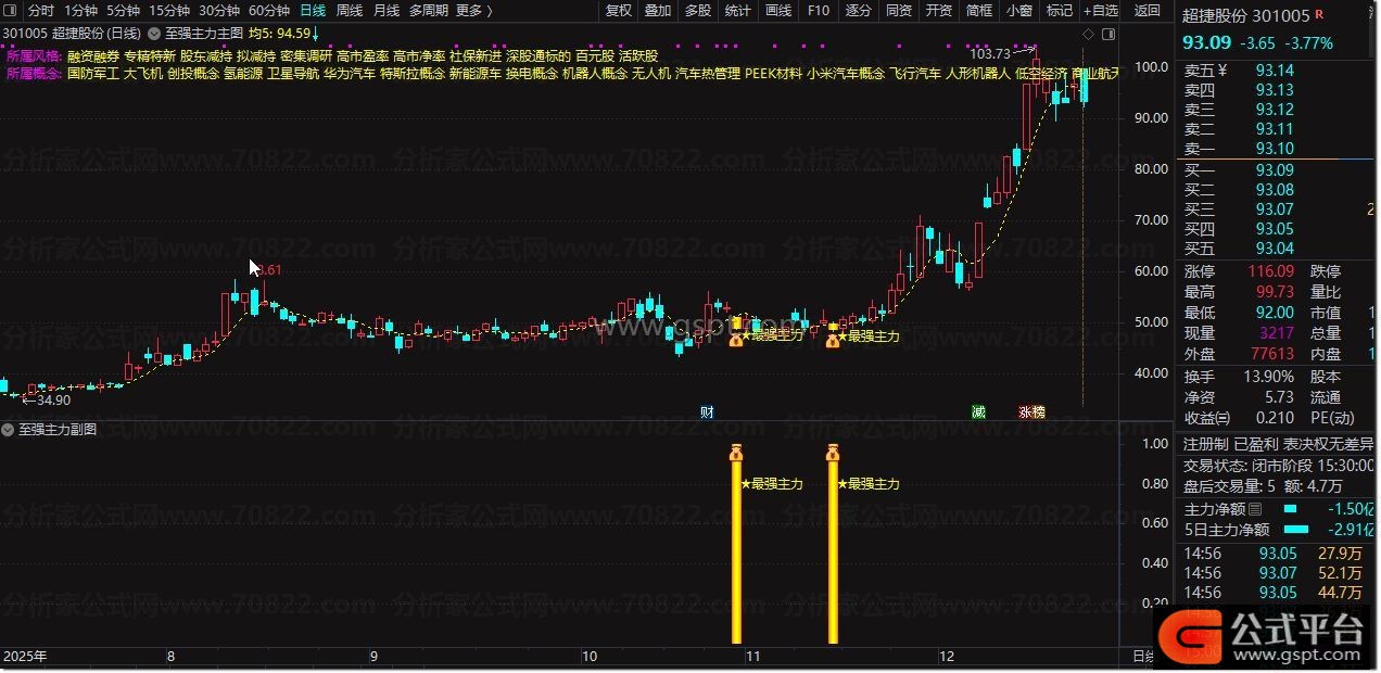1. 副图加载公式后,当出现“★最强主力”彩色柱线+笑脸图标,代表主力资金异动明显;