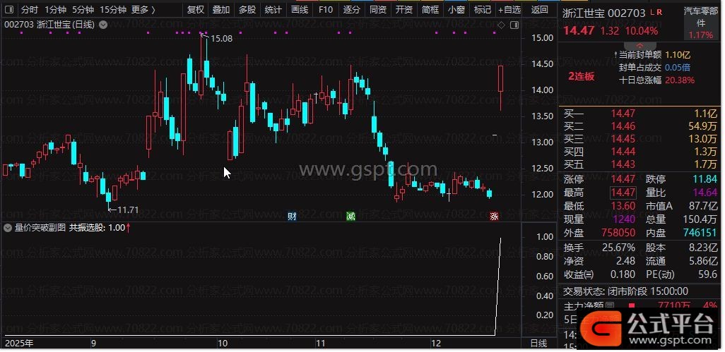 放量突破:= DYNAINFO(4)>0 AND HHV(HIGH,10)/LLV(LOW,10) < 1.25 AND REF(CLOSE,1) < (LLV(LOW,15) + (HHV(HIGH,15) - LLV(LOW,15)) * 0.85) AND CLOSE > OPEN AND CLOSE >= HHV(HIGH,10);