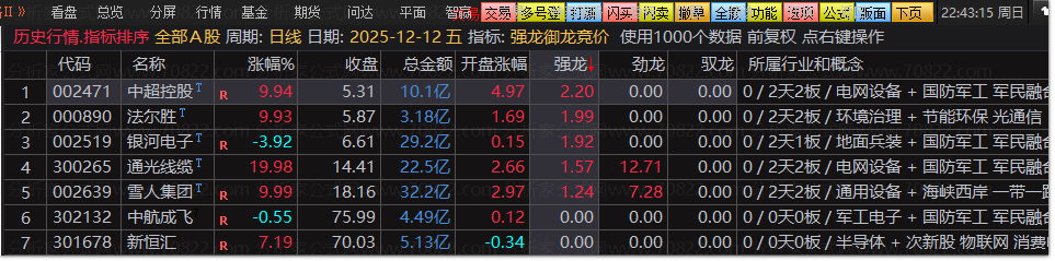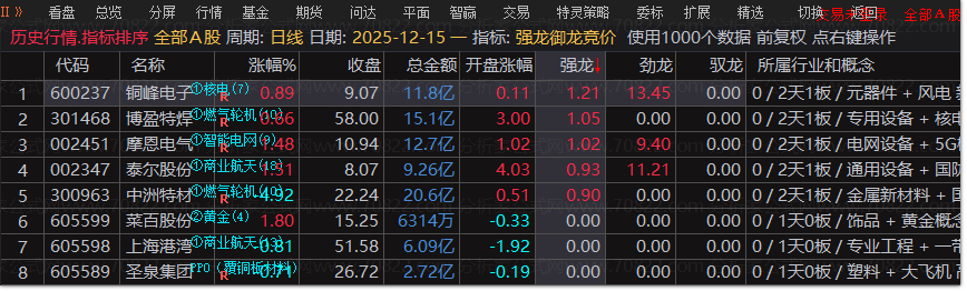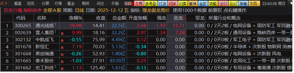 在通达信软件中,9:25至9:30间按快捷键.401调出指标排序界面,选择“强龙御龙竞价”指标,系统将自动对全市场A股进行竞价排序,快速筛选符合“一进二”策略的潜力股。