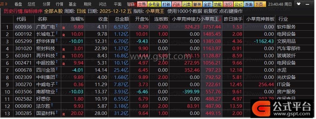 竞价结束9:25~9:30,键盘输入 .401 回车进入排序,更换排序指标为“小草竞王”