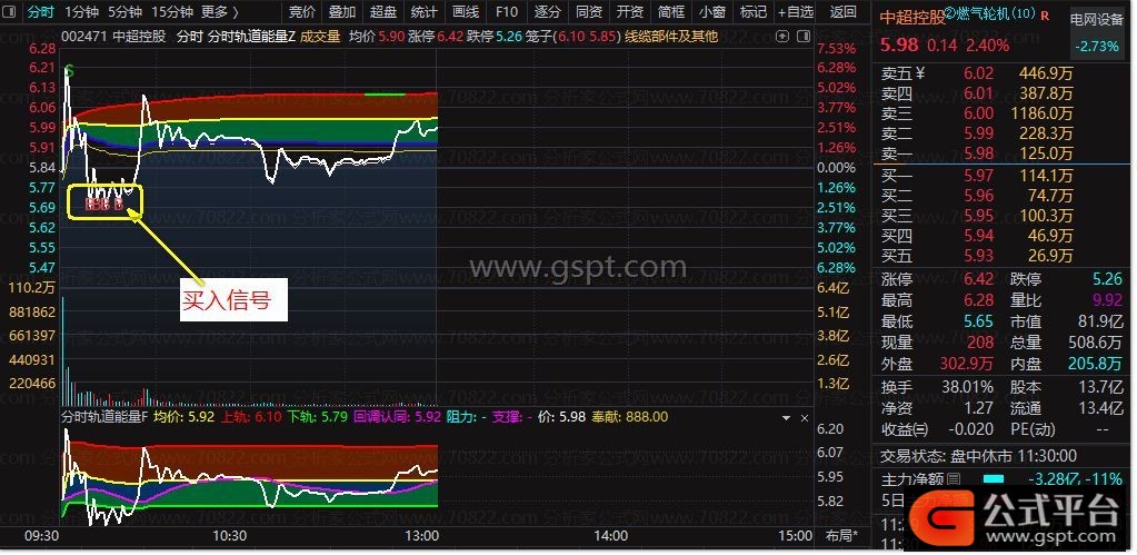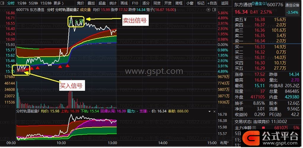 主图指标“分时轨道”在分时图绘制上轨、中轨、下轨及现价线。轨道方向与价格关系提示趋势买卖点,如轨道变红为上攻趋势并附带图标信号。副图指标“分时能量”位于分时图下方,含均价线、上下轨、回调认同线及阻力支撑位,通过红绿柱状图直观显示股价突破关键位情况。