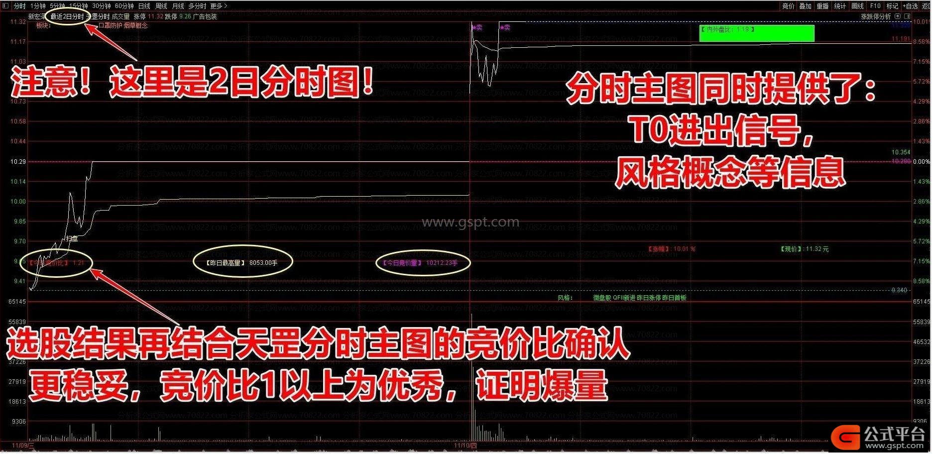 天罡分时主图:天罡分时,两个作用,一是对竞价排序目标标的爆量确认(需要打开2日分时);二是分时进出场点提示,日内T+0。