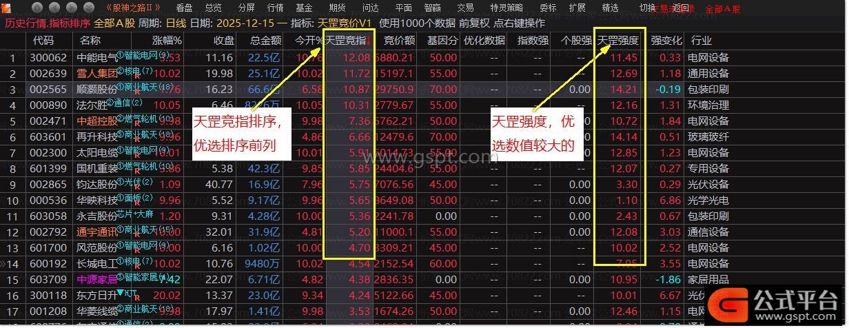 竞价排序指标:天罡竞价,主要用于9:25~9:30的竞价强度排序,用于筛选最强个股。